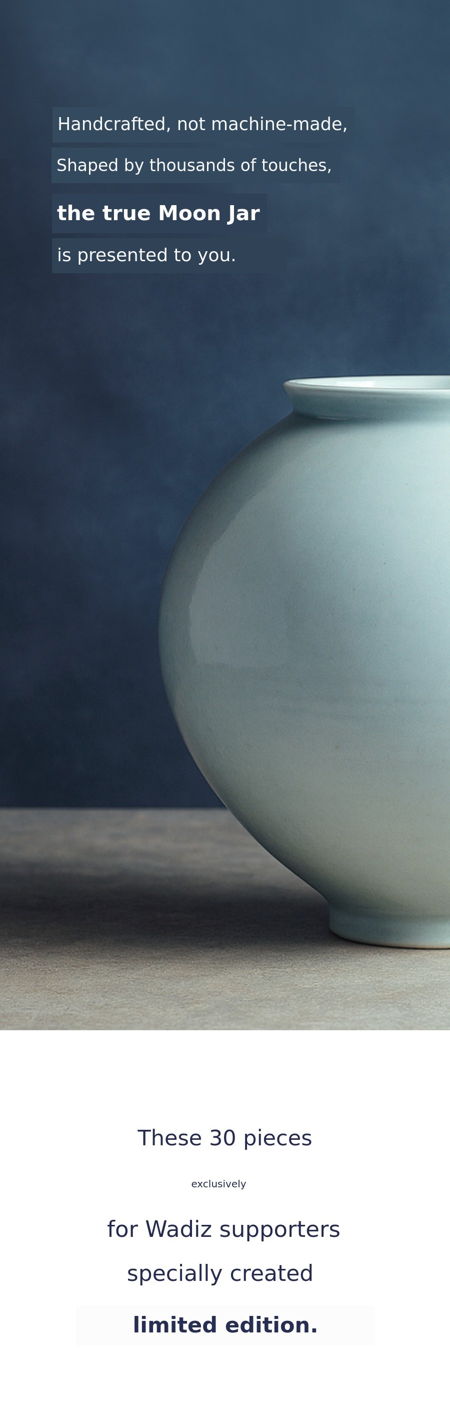 Master Jang Young-an's Jade Moon Jar is not just a simple piece of pottery, but a disappearingtraditional value revived in the modern era. It is a precious work. To let more people know about the master's work, which is filled with countless hours and dedication, and to share its value, we chose Wadiz funding as our method.