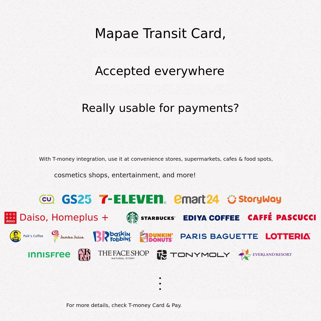 But the Mapae transportation card is aT-money integrated card type so,it can be used at various T-money affiliated stores such as convenience stores, marts, cafes & food, cosmetics, and more. Did you know that?