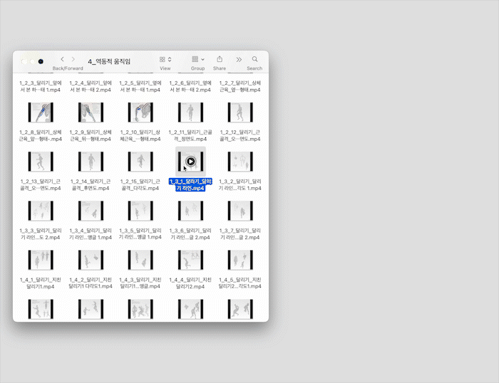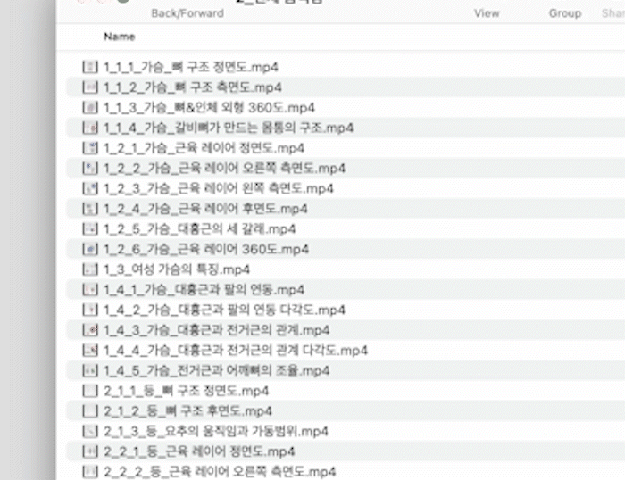 All materials are provided in MP4 video file format, and just by looking at the file name, you can immediately identify the chapter, body part, and type of material (bone/muscle/movement), allowing you to quickly find the desired material.