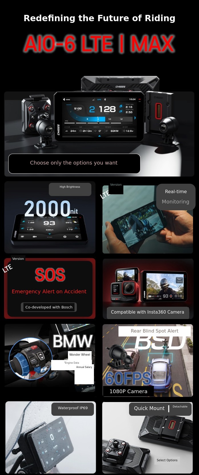 1. 🏍️ Smart Riding Device AIO-6 Series - Features high-brightness display and real-time monitoring 2. 🛡️ Enhanced Safety SOS Emergency Alert - Automatic location sent after 60-second countdown on accident 3. 🎁 Customizable Options and Pre-order Benefits - Selectable features with LTE version pre-order available