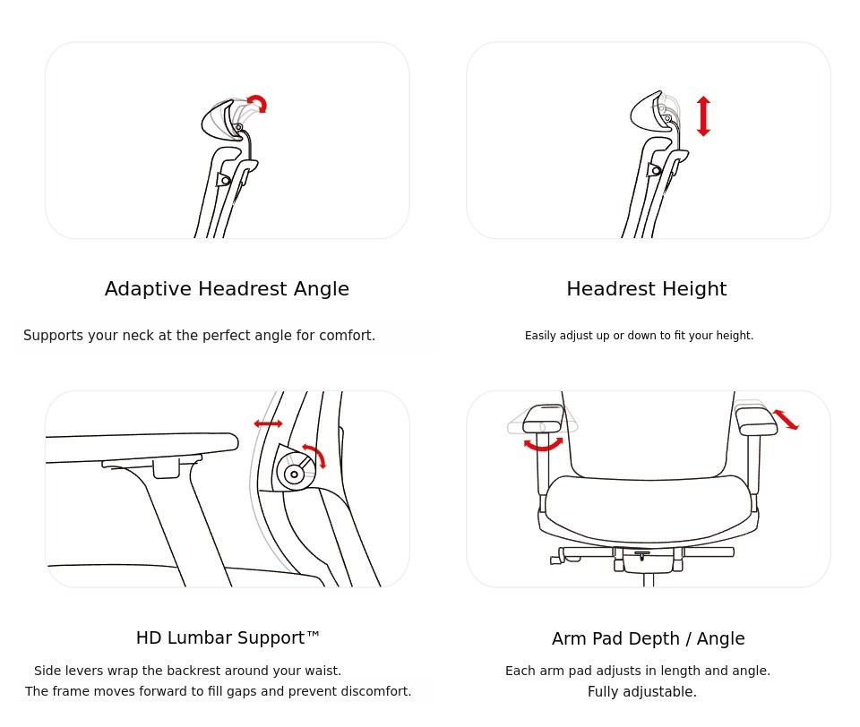 | Armrest | Fixed Armrest | 3D Armrest (Height, Depth, Angle Adjustable) |
