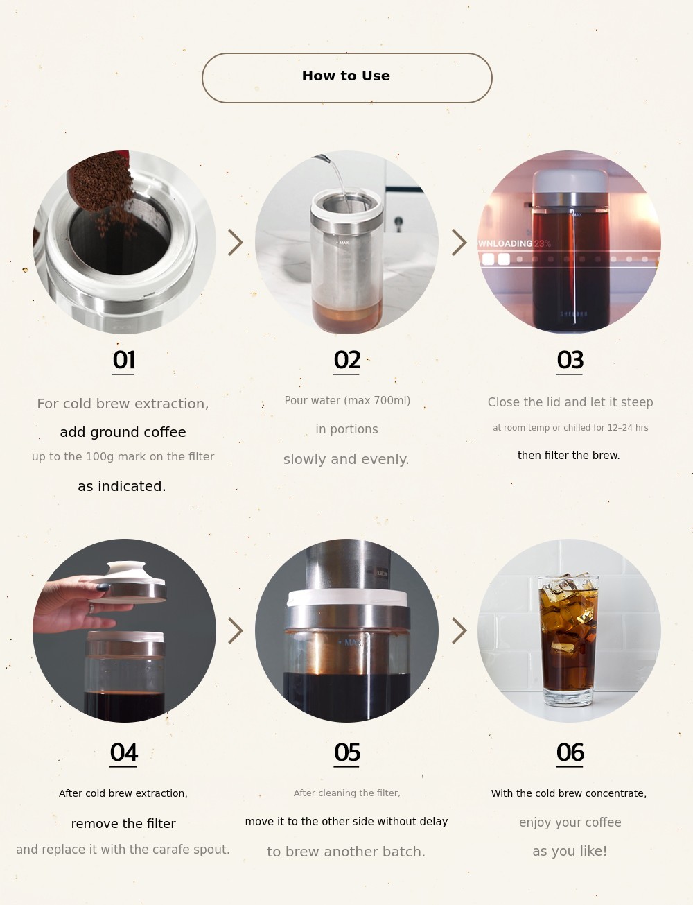 Since cold brew usually requires 12 to 24 hours of extraction time, you need to start a new extraction right after finishing one to enjoy cold brew coffee without interruption.
