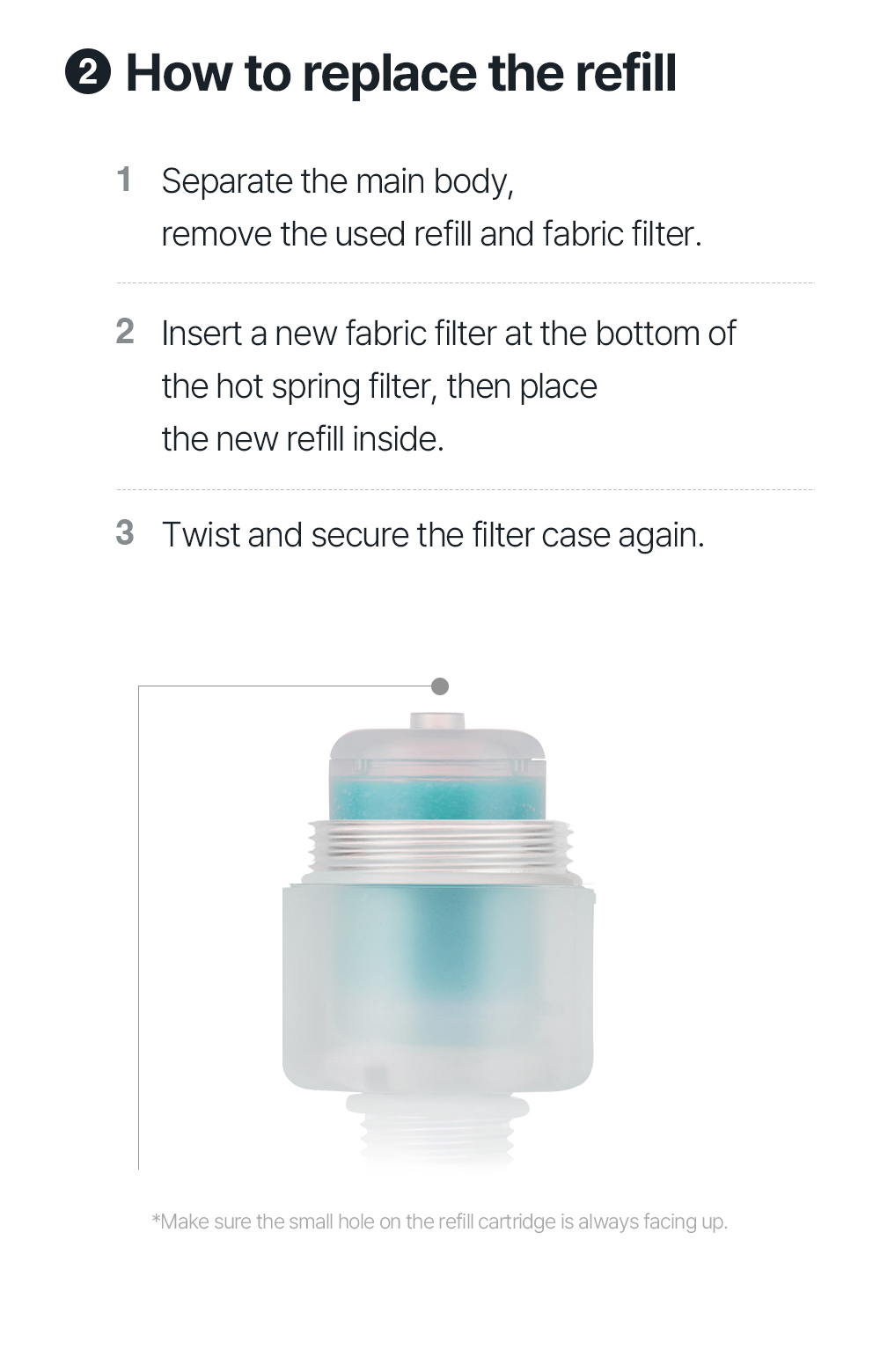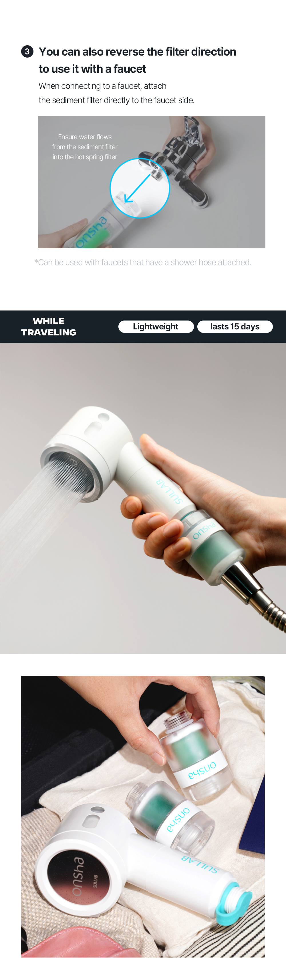 Compact travel-size filter with mini showerhead Enjoy hot spring showers even on the go.