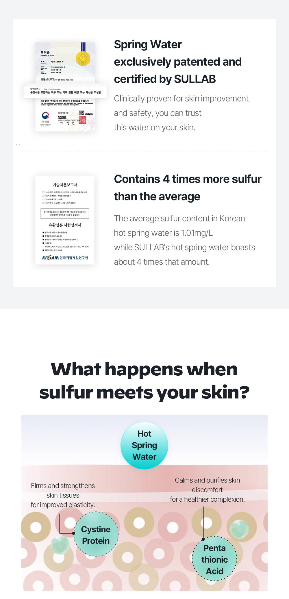 When sulfur touches the skin, pentathionic acid and cystine protein are naturally formed, supporting the repair of dry skin barriers and providing lasting hydration.