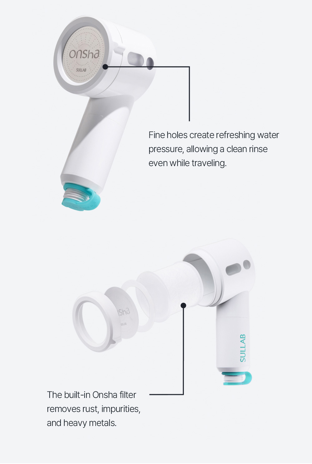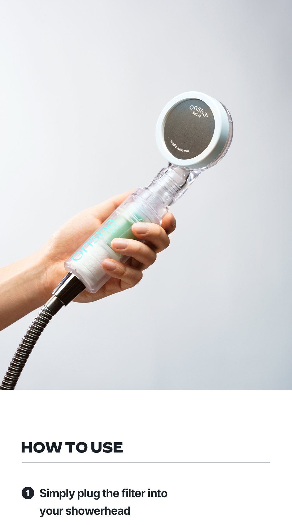 Forget long and bulky showerheads. Use Onsha with our compact, stylish dedicated showerhead.