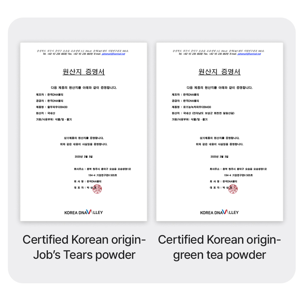 Don’t be fooled by products with just 5% active ingredients. Ours contains 52% Korean-grown Green Tea and Job’s Tears (Yulmu).