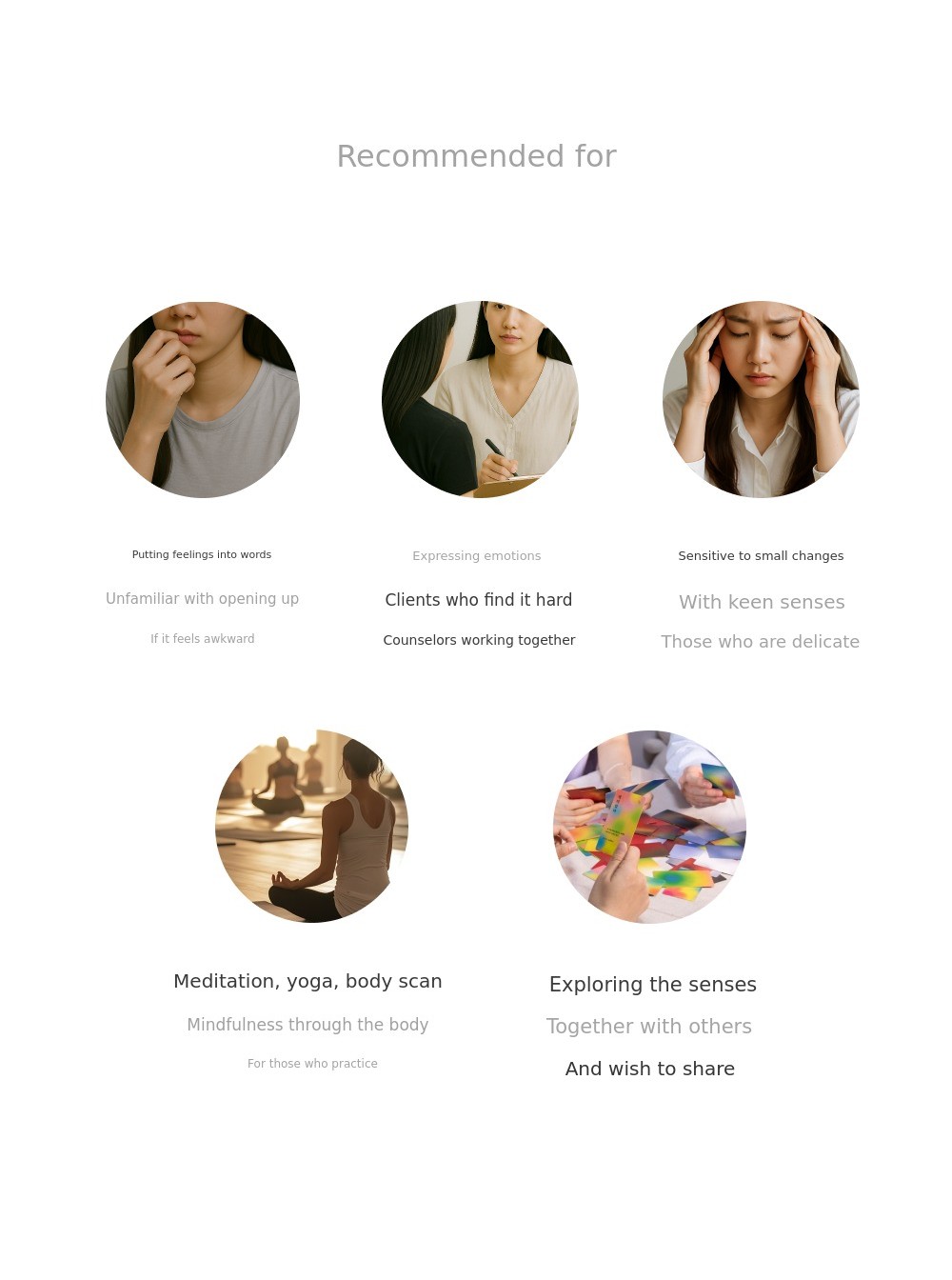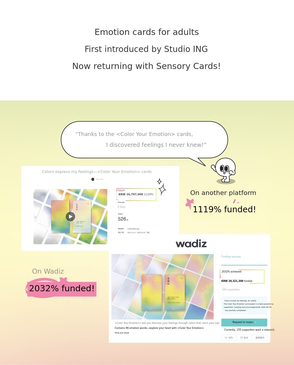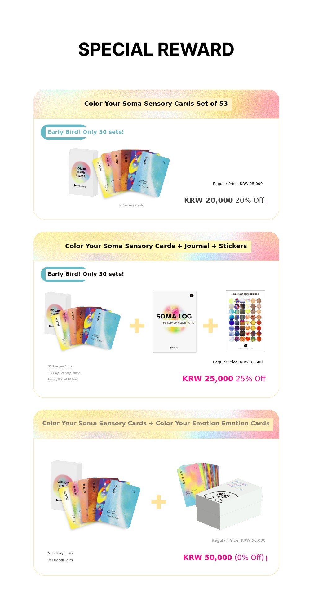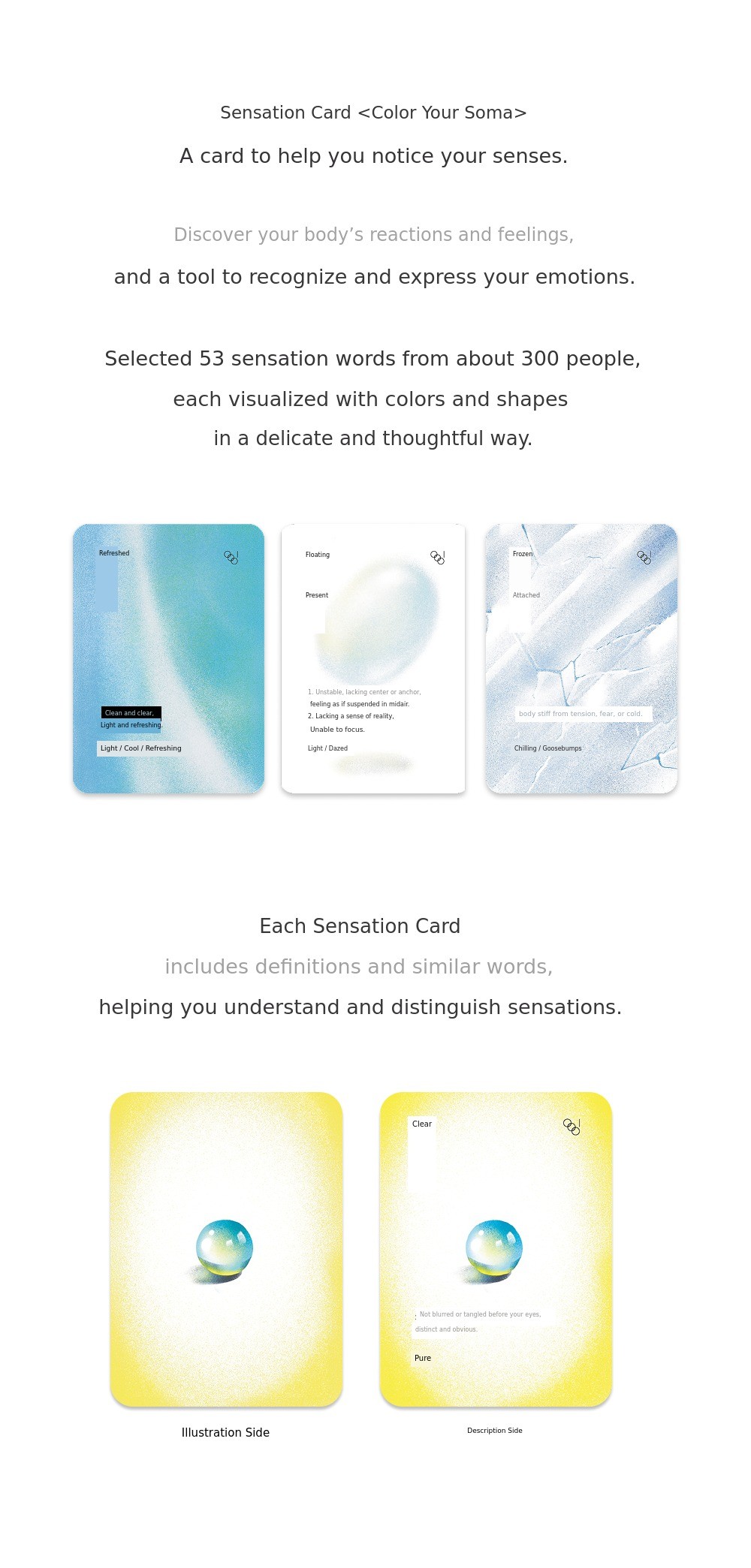1. π΄ Adult Sensory Card Set - Visualizes senses and emotions to aid self-understanding and expression 2. π§ Supports Emotional Recognition - Enables communication through senses for those struggling with verbal expression 3. π Backer Benefits - All participants receive SOMA character card set upon 1000% funding