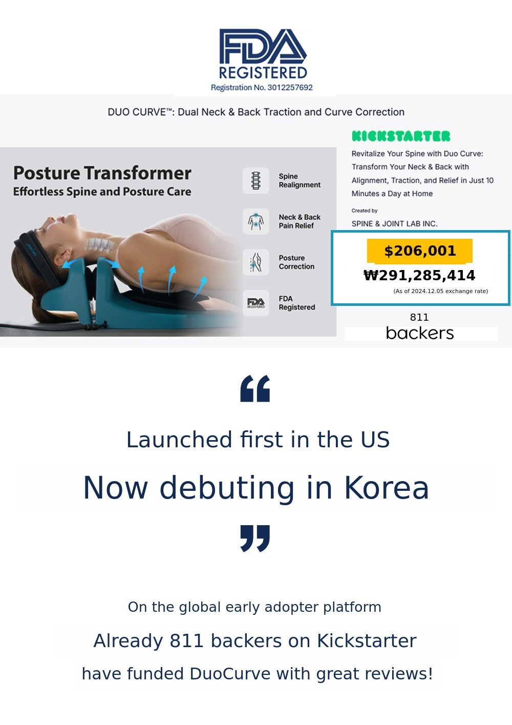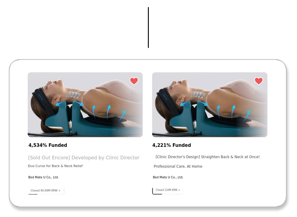 There were many moments when I wanted to give up due to communication issues with the U.S. during COVID-19 and unresolved mechanical design challenges, but with the help of many stakeholders, we succeeded in developing a prototype.Last October, we successfully completed crowdfunding of nearly 300 million KRW on the U.S. crowdfunding site Kickstarter. Now, in Korea, the birthplace of DuoCurve! We are excited to introduce it for the first time on Wadiz, where supporters are already familiar with the Fitneck pillow.