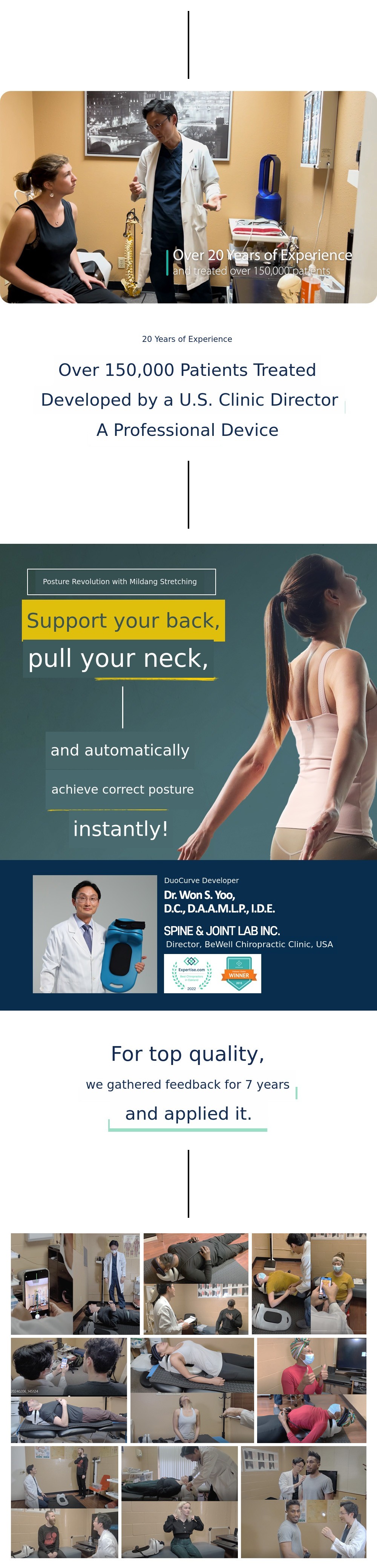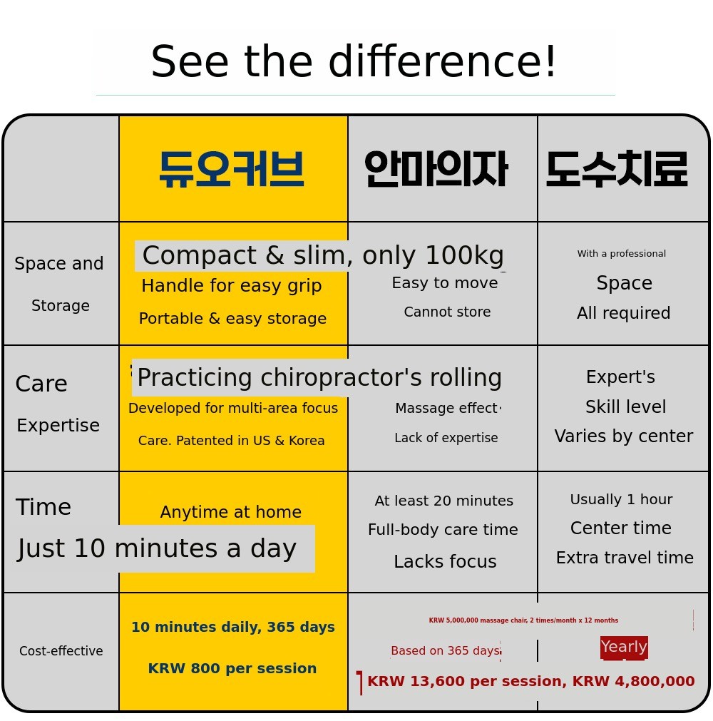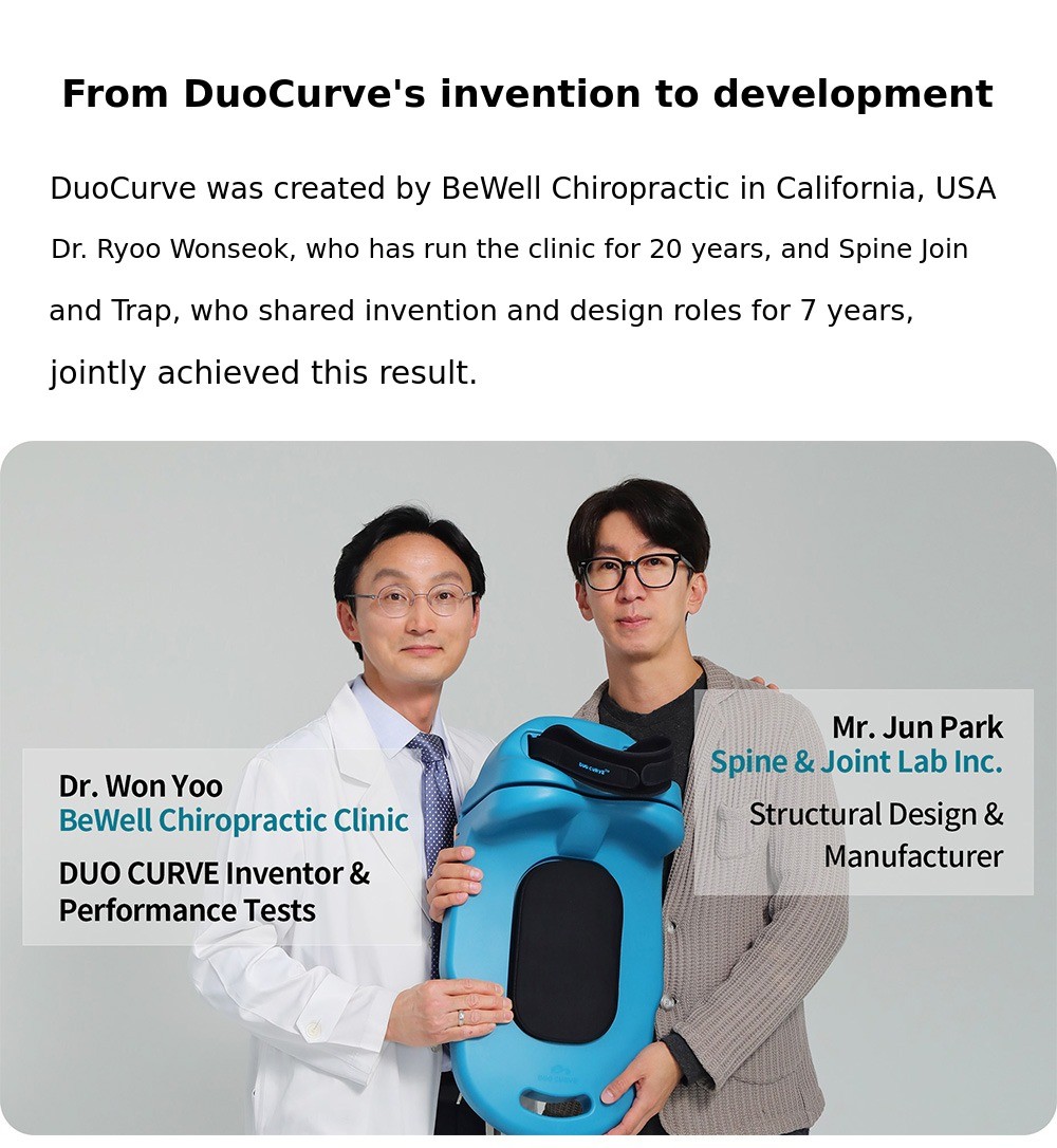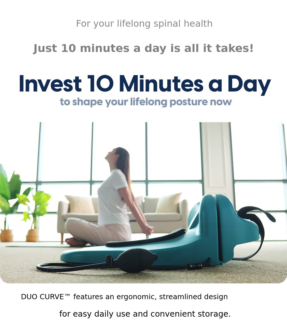 For those of us living in the era of 100-year lifespans, proper posture is most important. If you can maintain your spinal health with just 10 minutes a day, there is no need to hesitate. After using DuoCurve for 10 minutes and standing up, you will immediately feel your chest open and your spine straighten. If you use it consistently every day, not just for a day or two, you will definitely notice positive changes in your posture that has been affected by bad habits.
