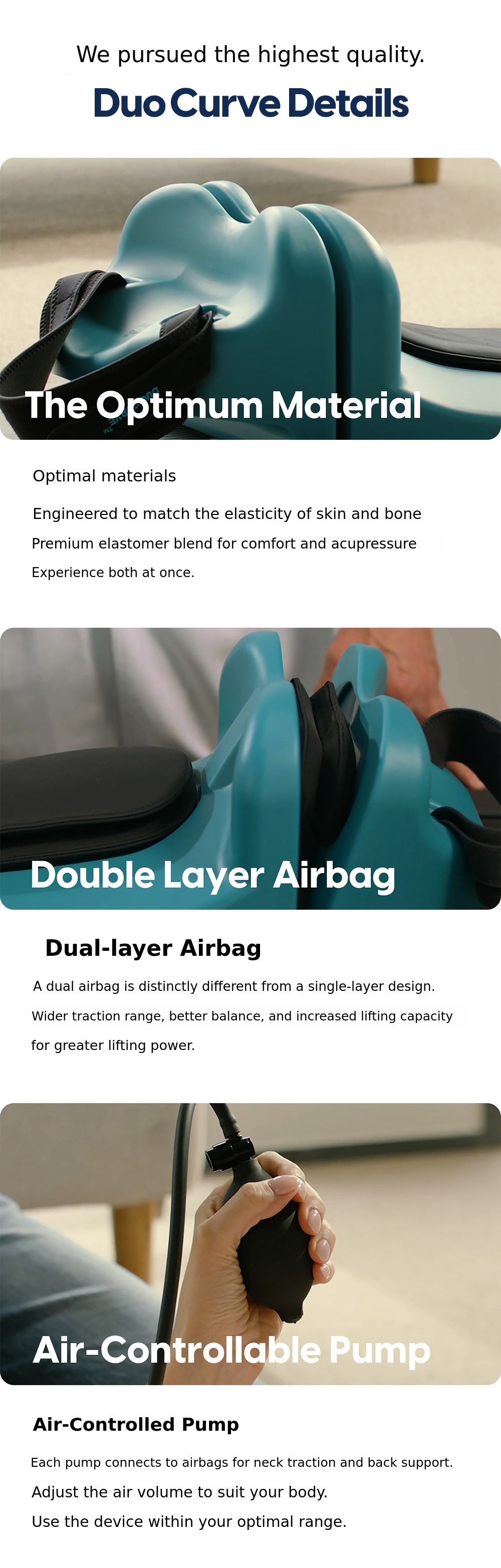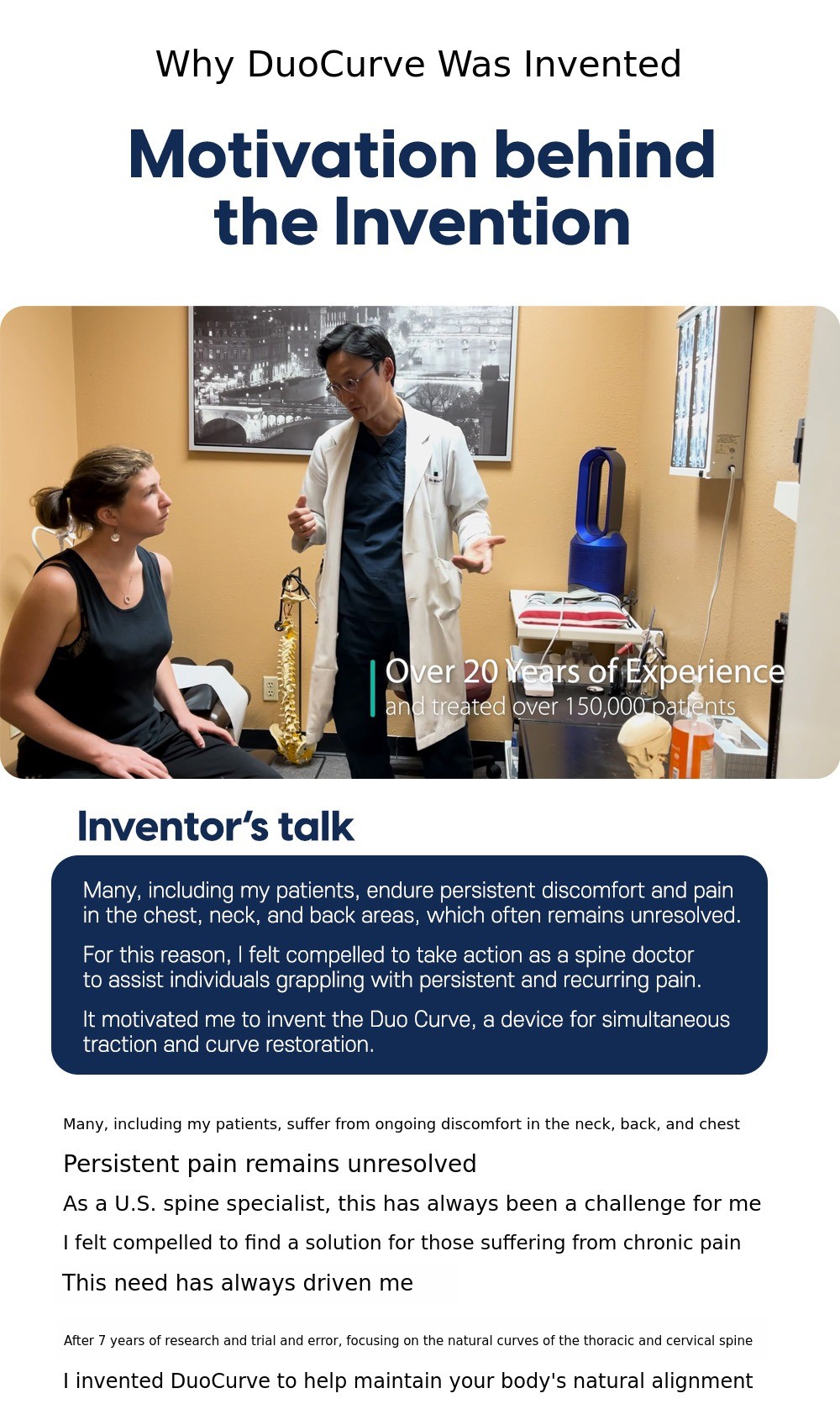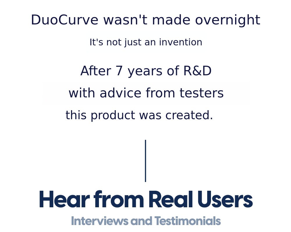 He messaged me saying there was a product he thought was absolutely necessary after caring for patients' pain in the field for 20 years, and asked if I could help develop it. As someone who has been designing and manufacturing functional pillows for better sleep, I gladly accepted. After many trials and errors with electric, rail, and air power sources, the current DuoCurve was born.