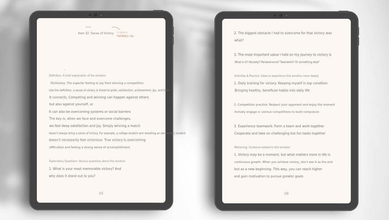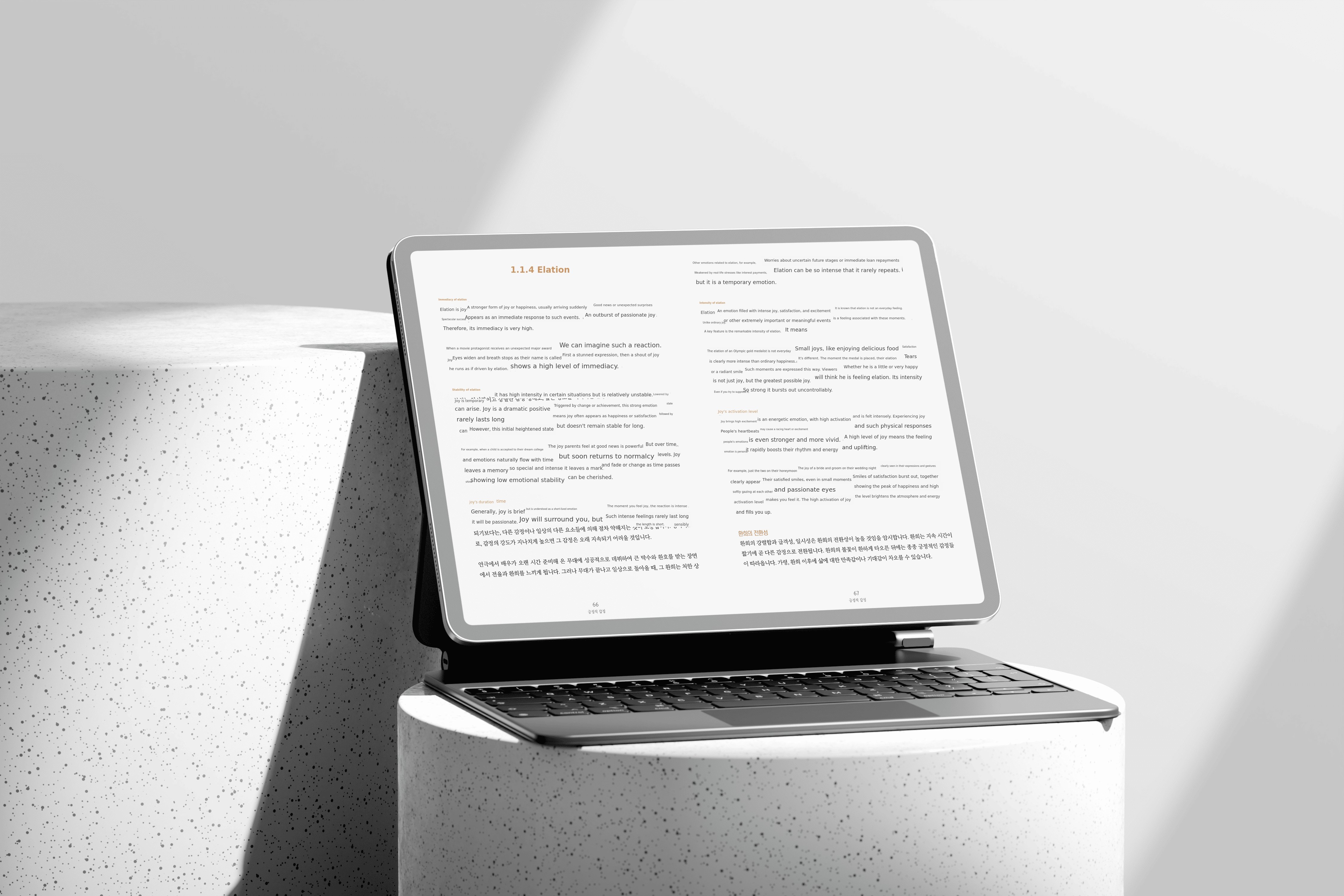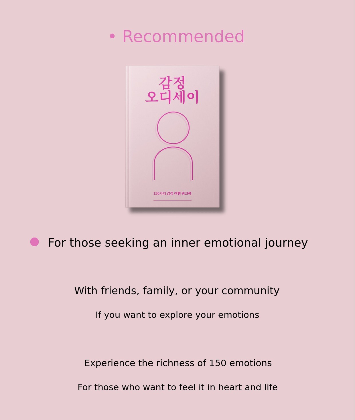 With that in mind, we planned the [Emotion Odyssey: Guidebook Workbook for a Journey Through 150 Emotions]. Following the [Emotion Classification, Analysis, and Delivery Dictionary], which contained detailed analyses of emotions, we now introduce [Emotion Odyssey 150], designed to help you intuitively, sensorially, and practically reflect on and internalize each of the 150 emotions.