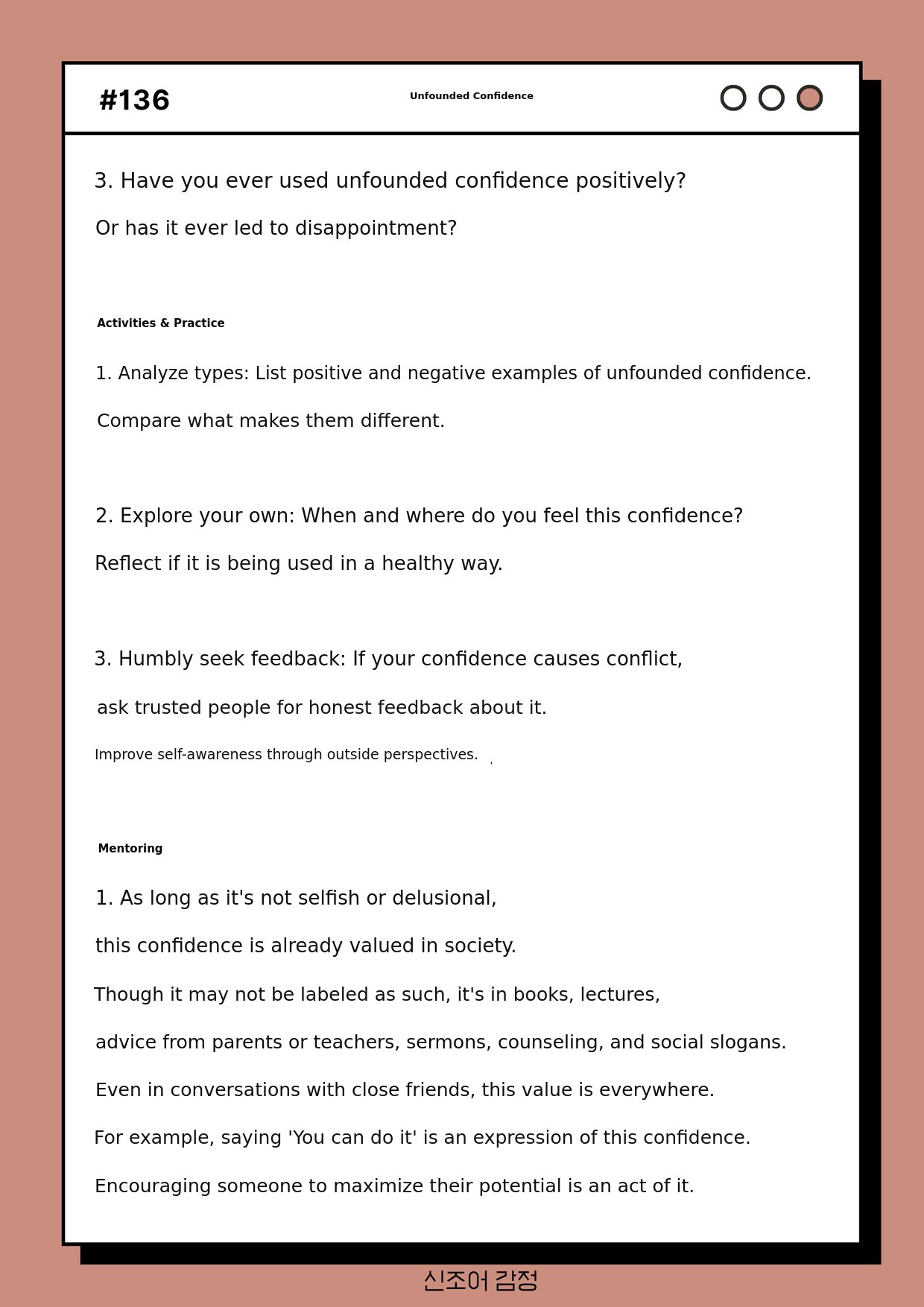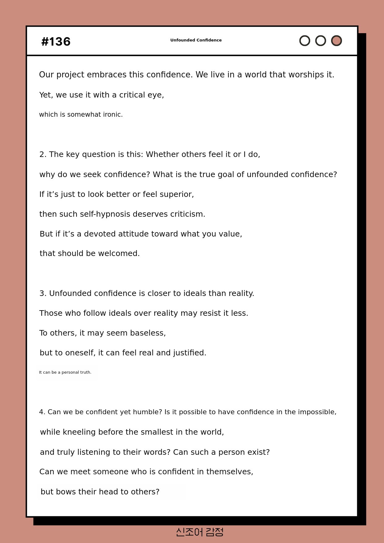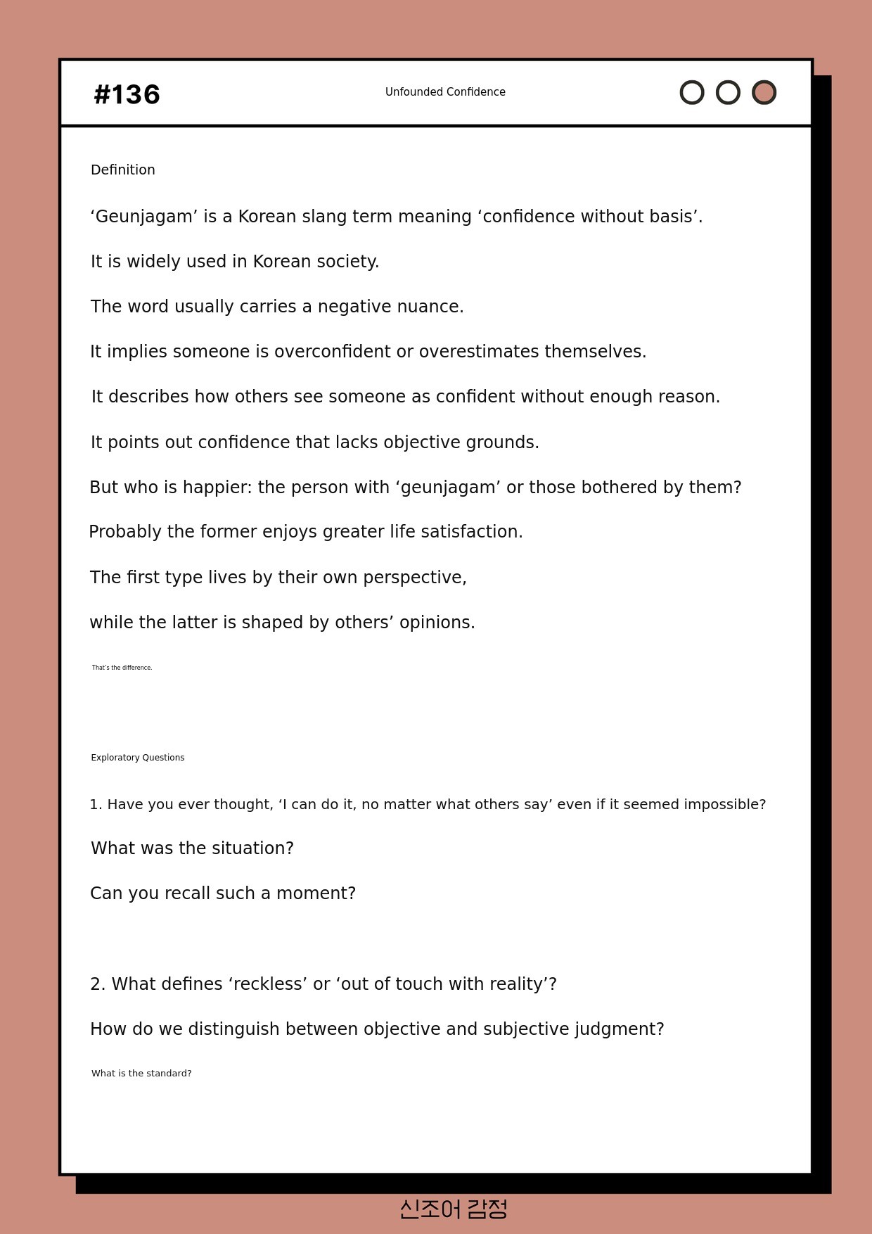 6.1 Unfounded Confidence / 6.2 Small But Certain Happiness / 6.3 FOMO / 6.4 JOMO / 6.5 FOBO / 6.6 Funny Yet Sad / 6.7 Heart-Fluttering / 6.8 Menbung / 6.9 Isaengmang / 6.10 Isaengheung / 6.11 Gwantaegee / 6.12 Seubuljae / 6.13 Cider / 6.14 Yeolpok / 6.15 Unfounded Complex