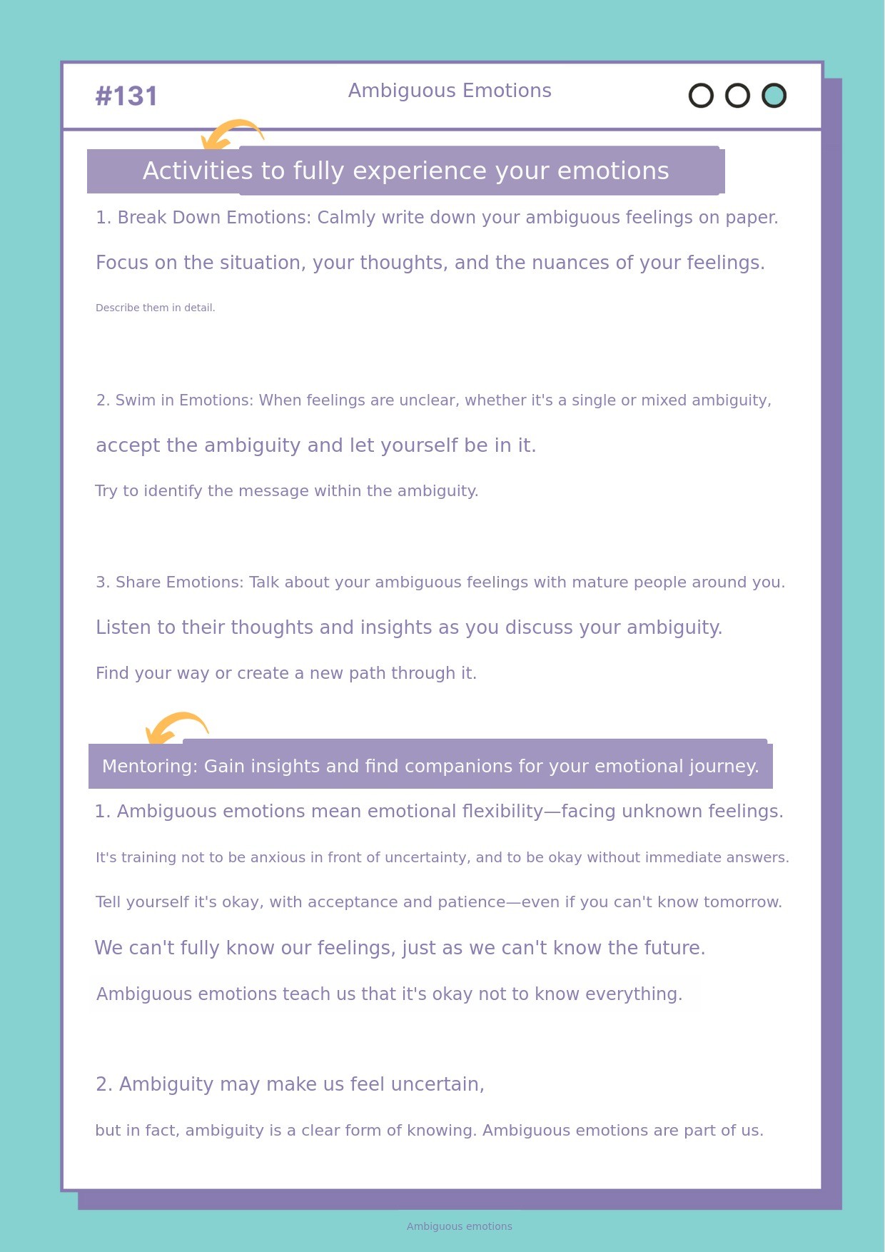 3. Activities and Practices: Suggests three activities to help you fully experience each emotion or feel its meaning.