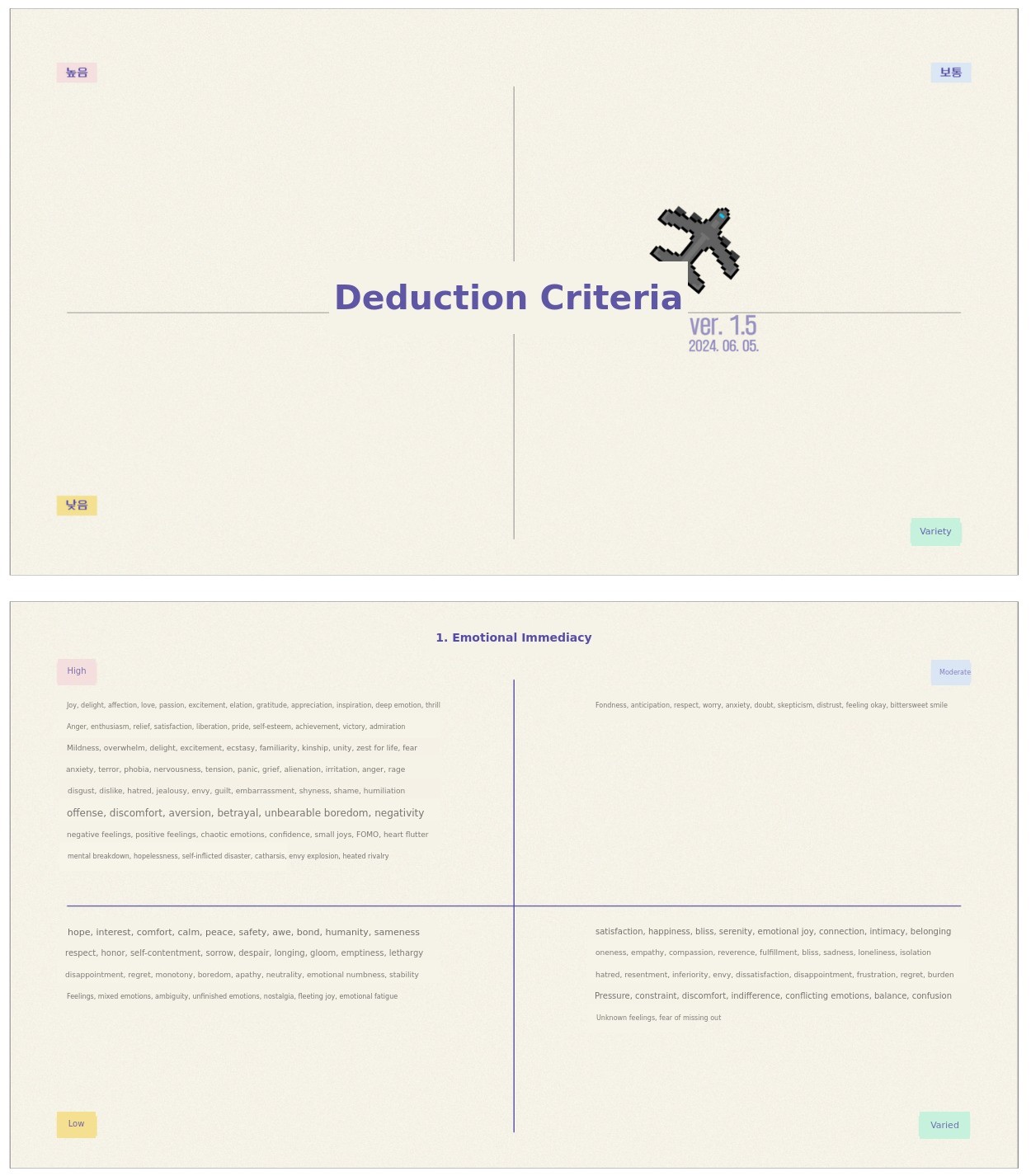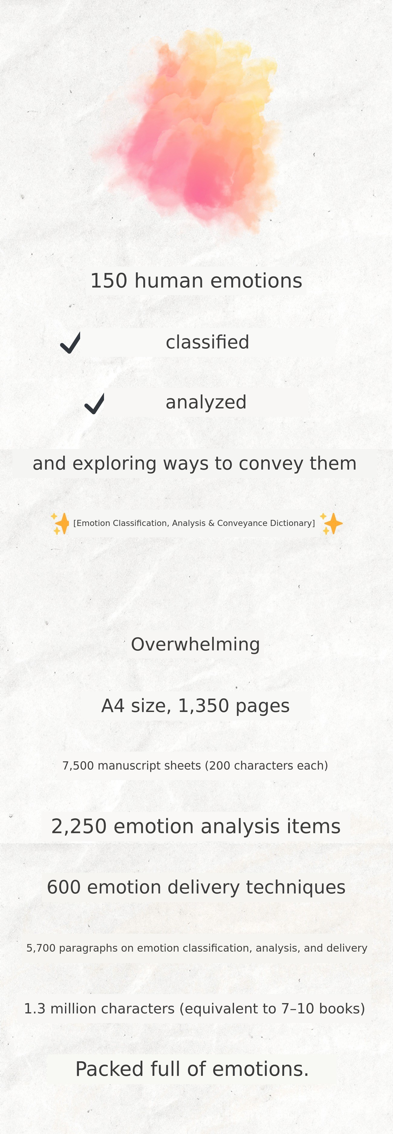 - Emotion classification table PDF provided: This is a visual material that allows you to see at a glance the results of evaluating 150 emotions covered in the [Emotion Classification Dictionary] using 15 different emotional analysis tools. For each of the 15 measurement tools, you can see to what degree each of the 150 emotions is represented.High, medium, low, varied are shown. It is composed of 18 pages including the cover, in a 16:9 ratio. It is provided as a PDF file for you to download.