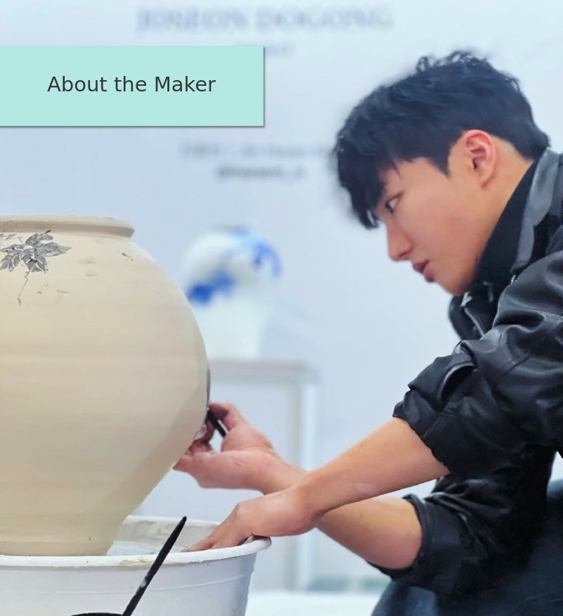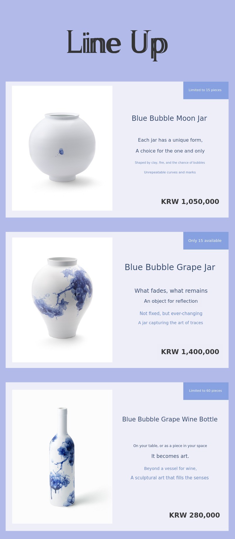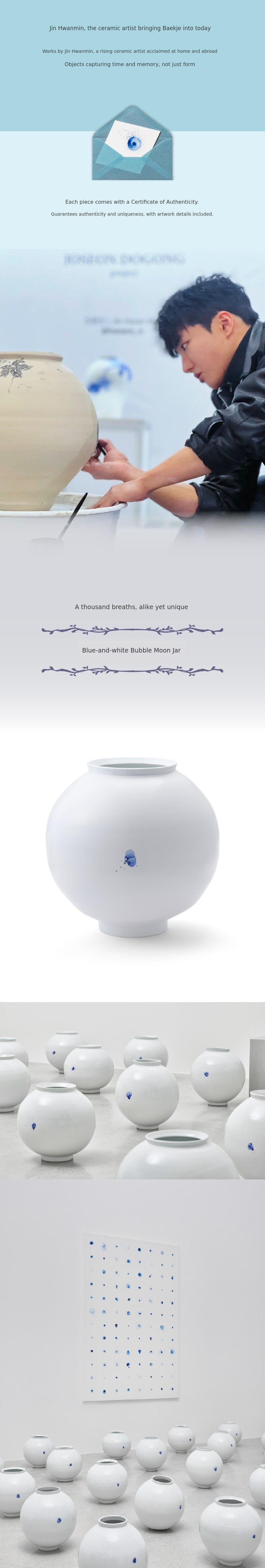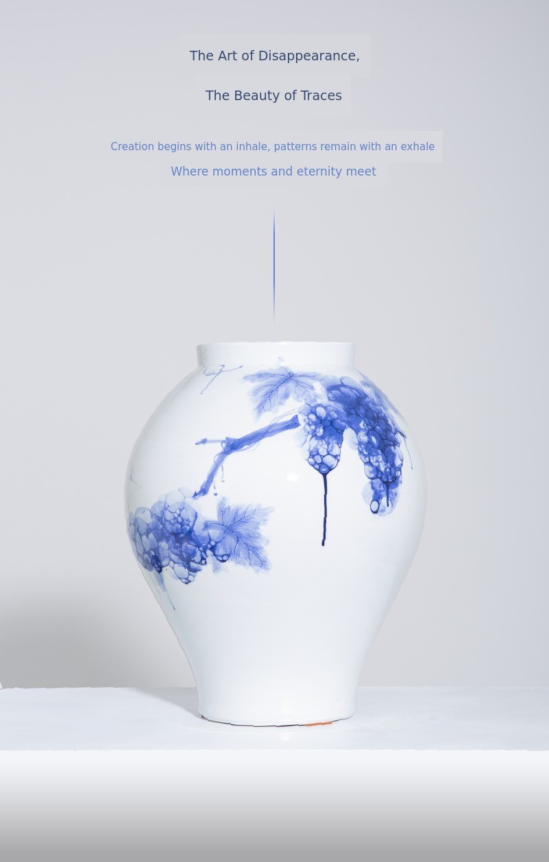 I interpreted the Korean traditional grape pattern as a symbol of 'bubbles,' and developed an original technique of blowing blue pigment into ceramics using soap bubbles. Through the process of shaping dozens of jars and blowing hundreds of breaths, my emotions, time, and breath take form.