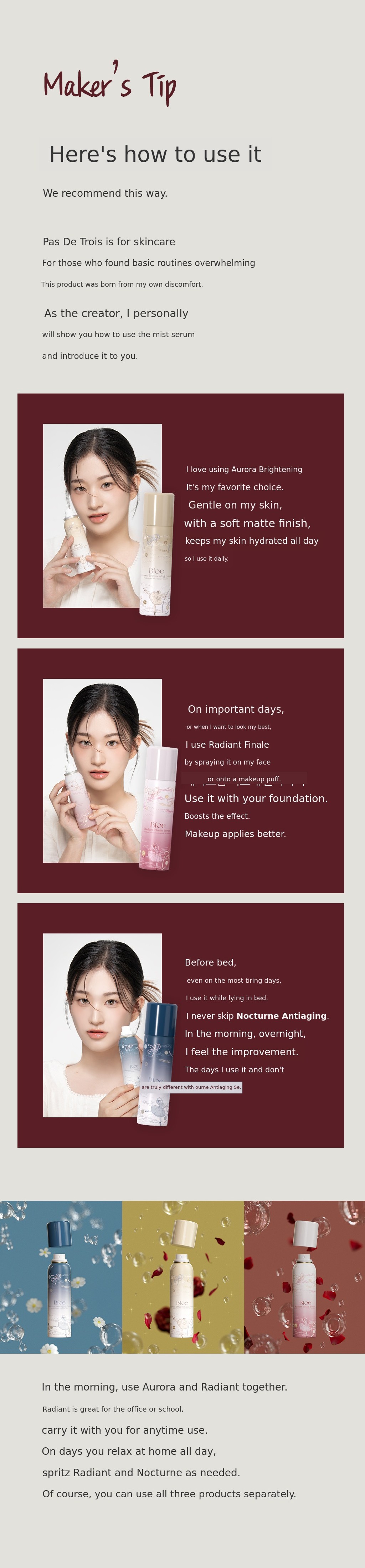 A4. The 'Pas De Trois' mists are non-sticky and do not leave a white cast, providing a pleasant feel even when used before makeup. In the case of Radiant Finale, using it before makeup can enhance its synergy.