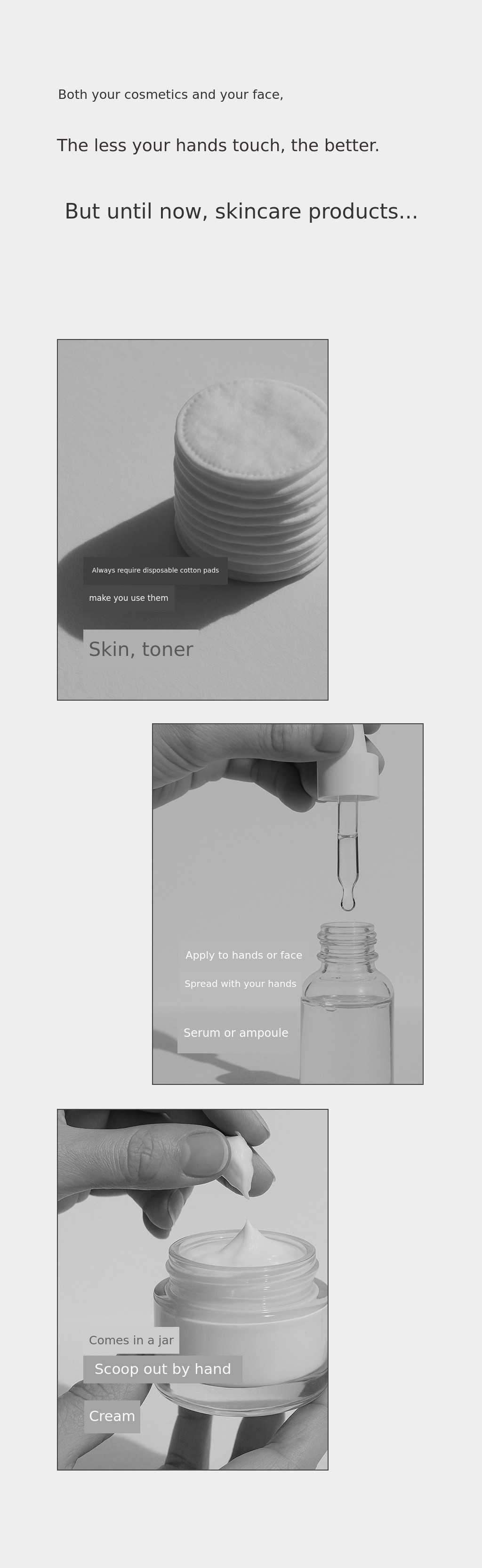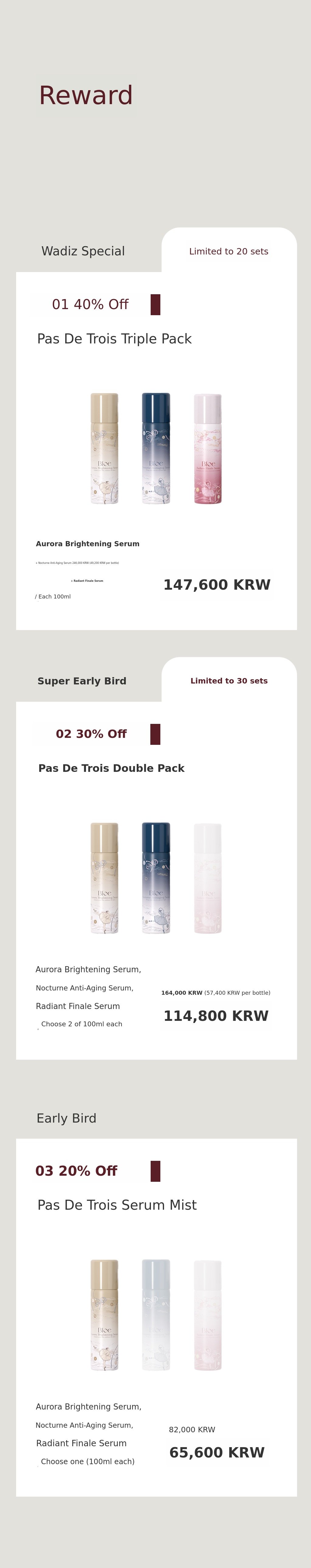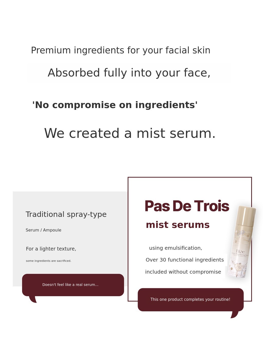 Q1. Do I have to use all three 'Pas De Trois' products?A1. Not necessarily. Each product alone provides the effects of skin + serum + ampoule. Using all three together offers synergistic benefits for improving skin tone, soothing hydration, and enhancing elasticity. Feel free to choose and use according to your skin concerns and lifestyle.
