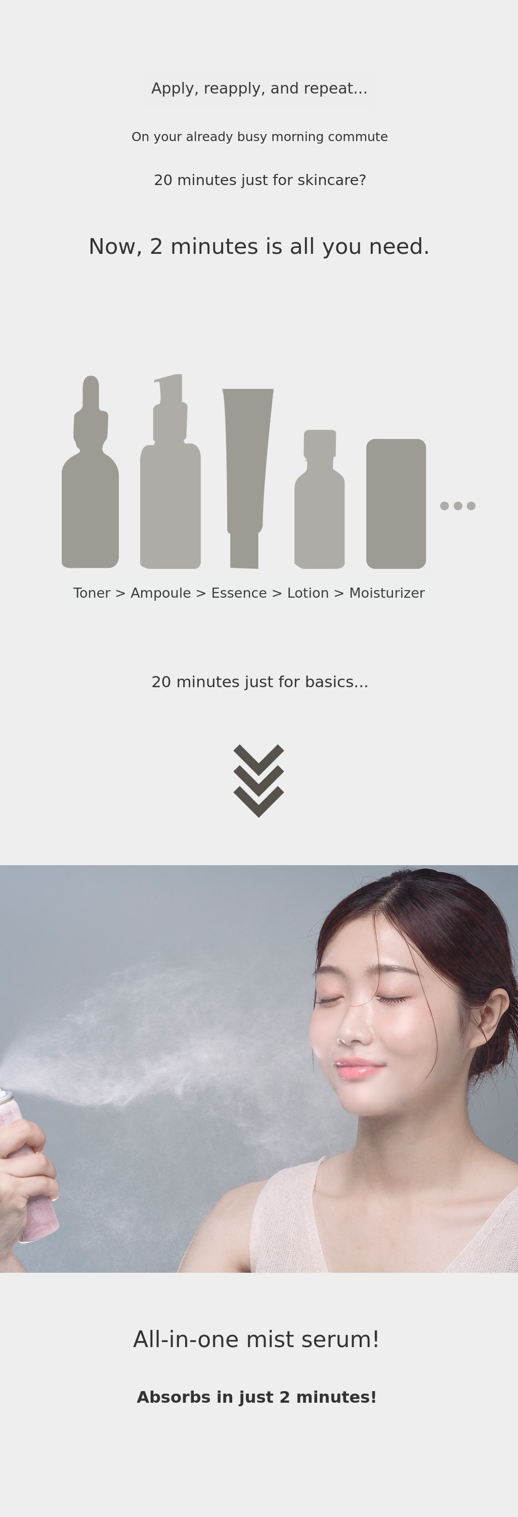 A3. For your morning routine, use the brightening mist; for your evening routine, use the soothing hydration mist to calm your skin. The third product, collagen mist, can be used anytime during the day when your skin needs elasticity. For best results, spray the brightening and collagen mists as the first step of skincare or before makeup, and use the soothing hydration mist like a sleeping pack for enhanced effectiveness.