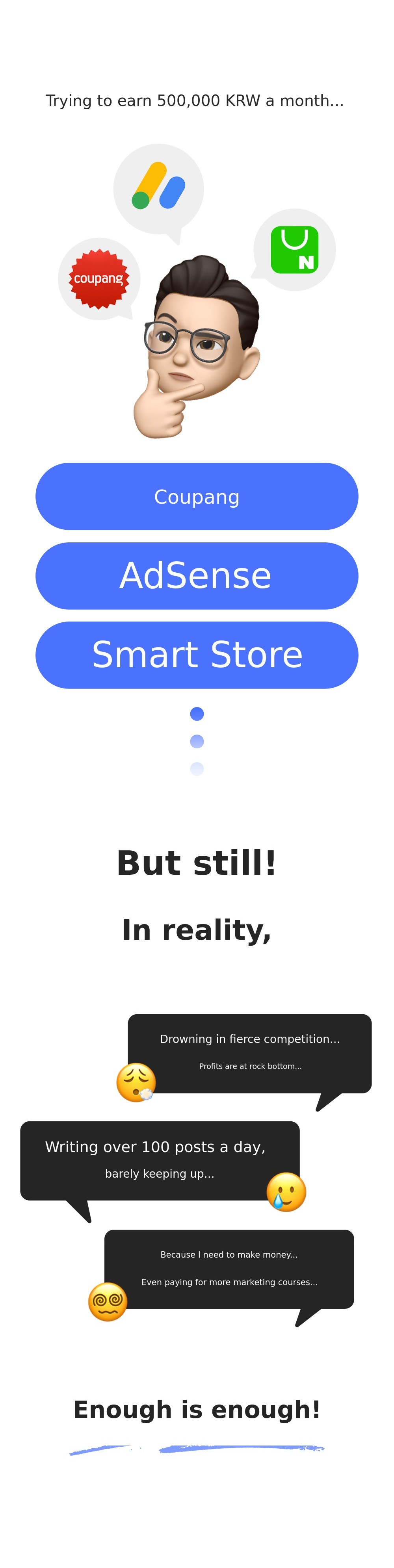 I tried various side businesses such as opening a store and proxy purchasing, but even after investing more of my time, I couldn't achieve a satisfying income.