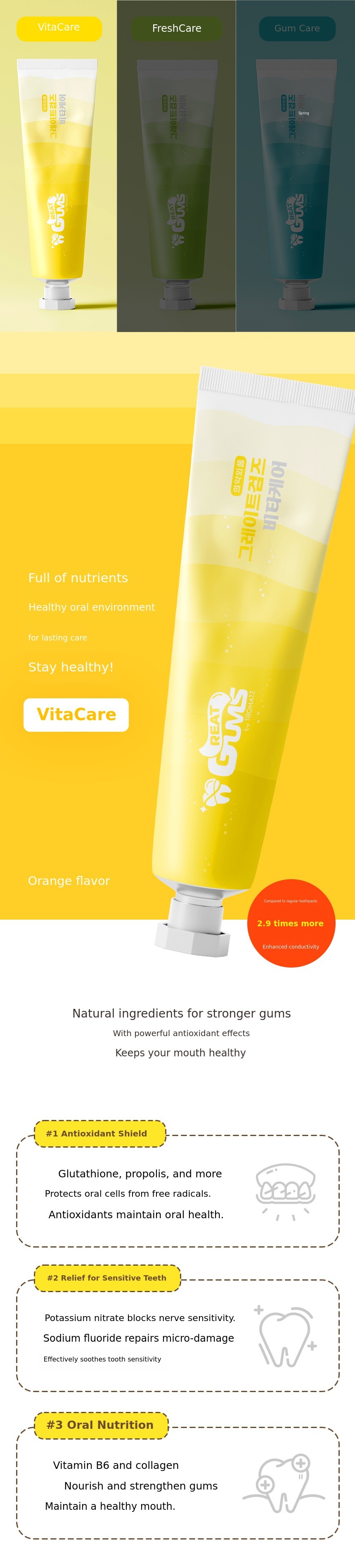 When used together with three specialized toothpastes for each purpose (Fresh Care, Vita Care, Gum Care),