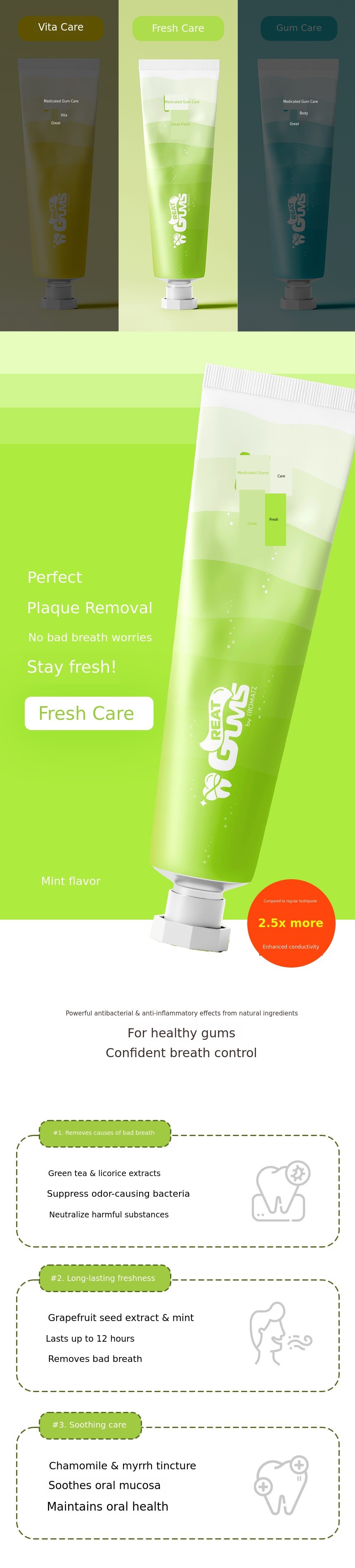1) Fresh Care: Eliminates the root cause of bad breath with sterilizing ingredients.
