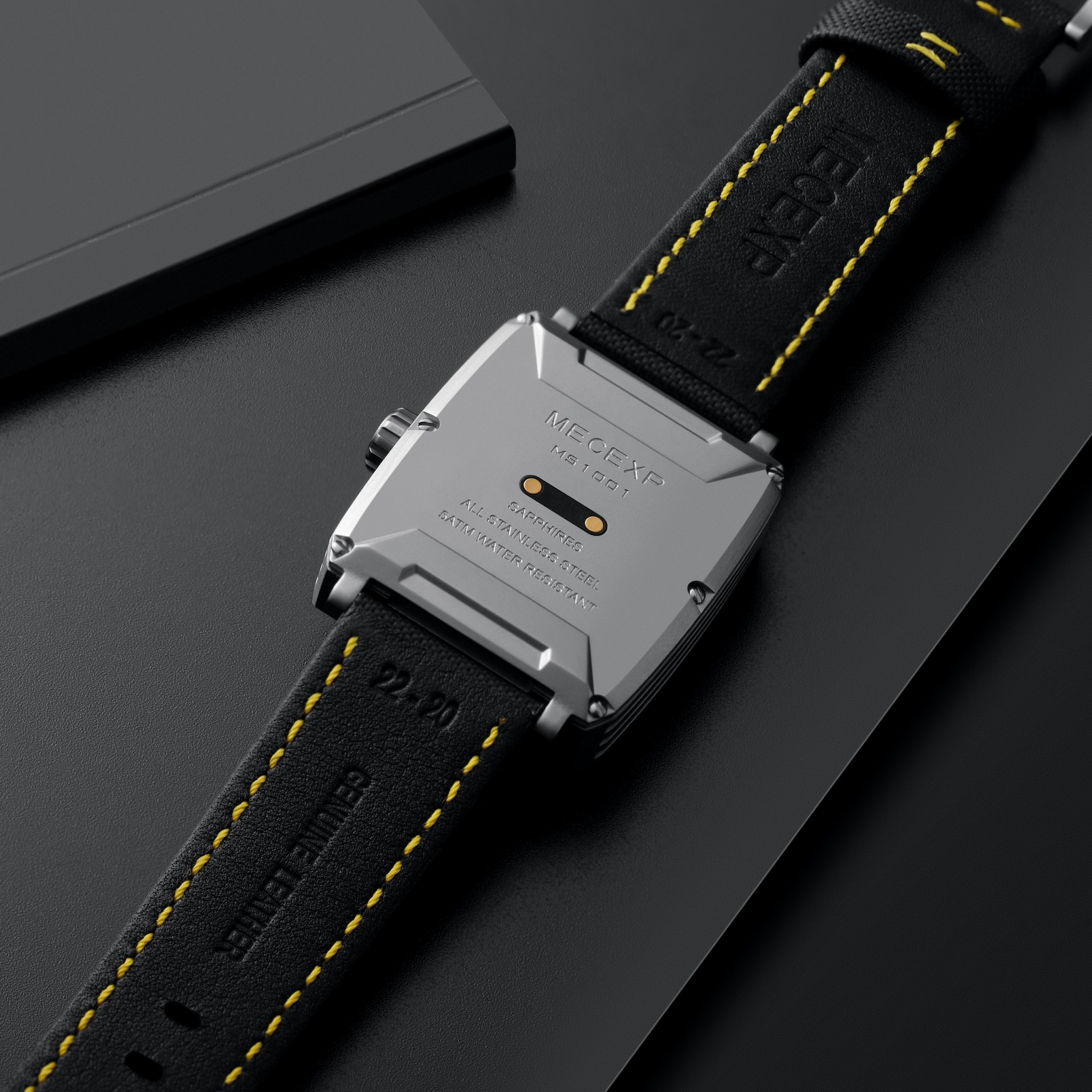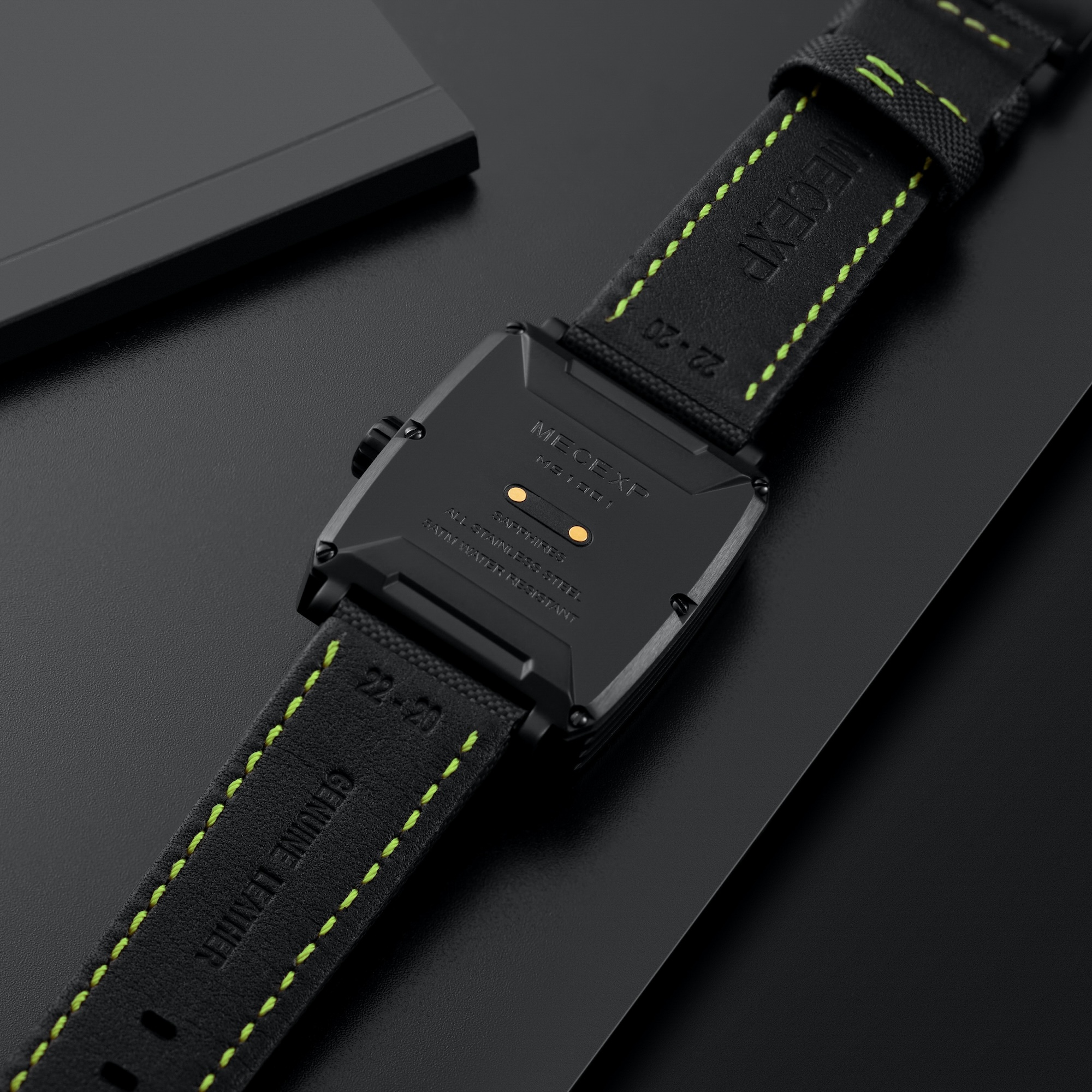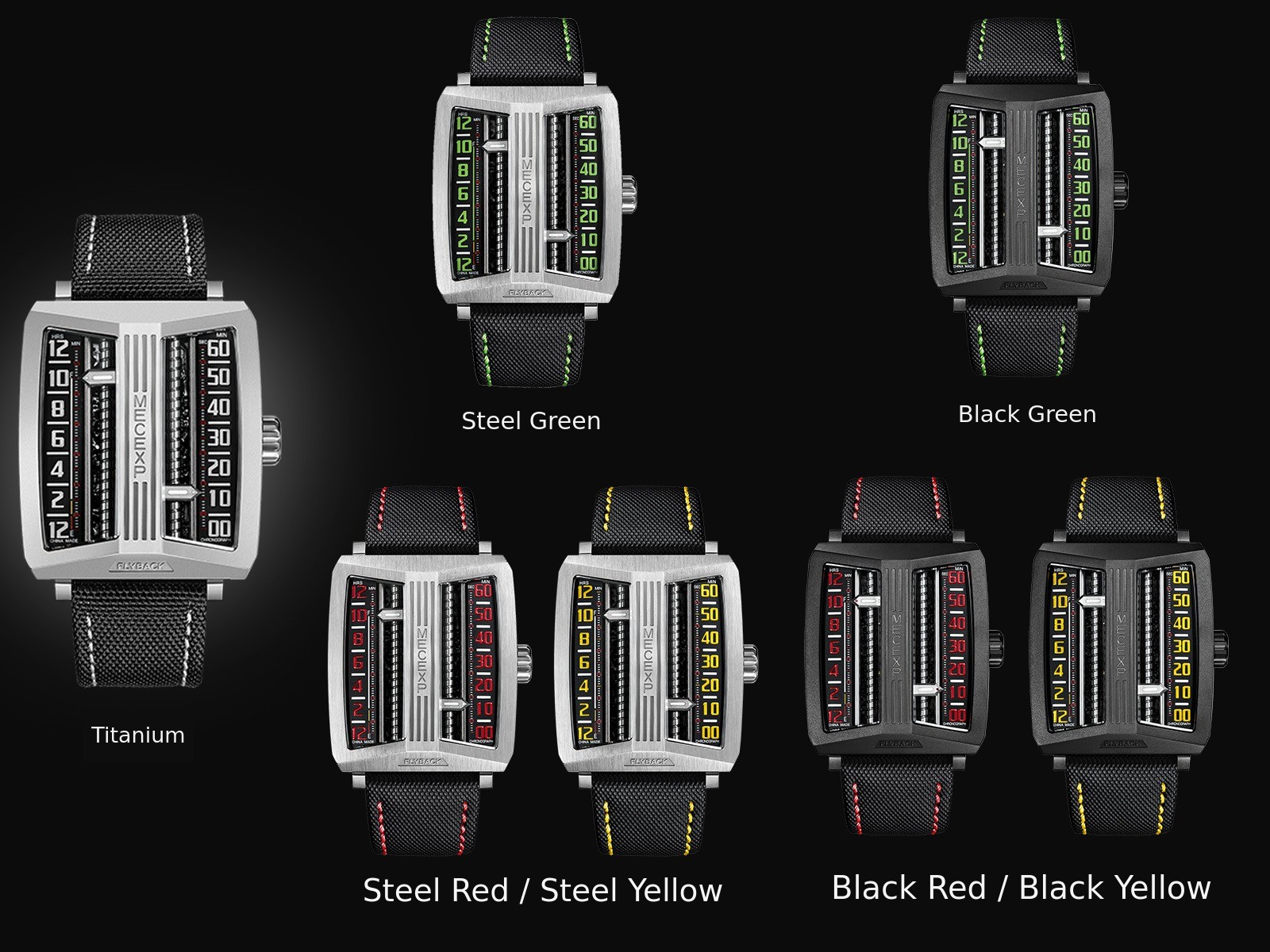 A titanium model that combines lightness and durability. Eye-catchingHigh-quality stainless steel, with a black model featuring PVD black coating comes in three color points: green, red, and yellow. Finished with color-matched stitching on the MECEXP signature strap for an even more stylish look. A total of seven different options are available.