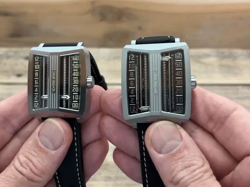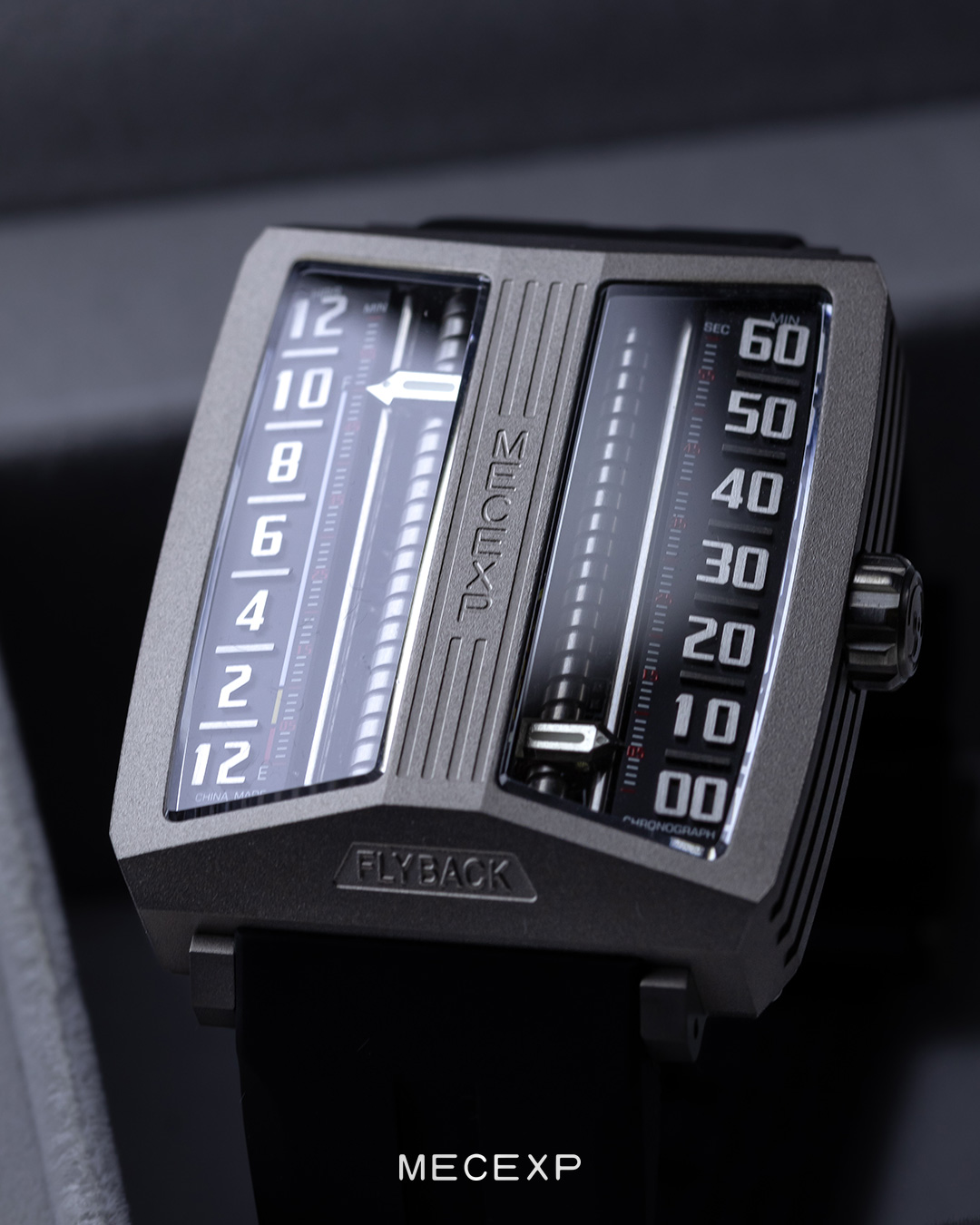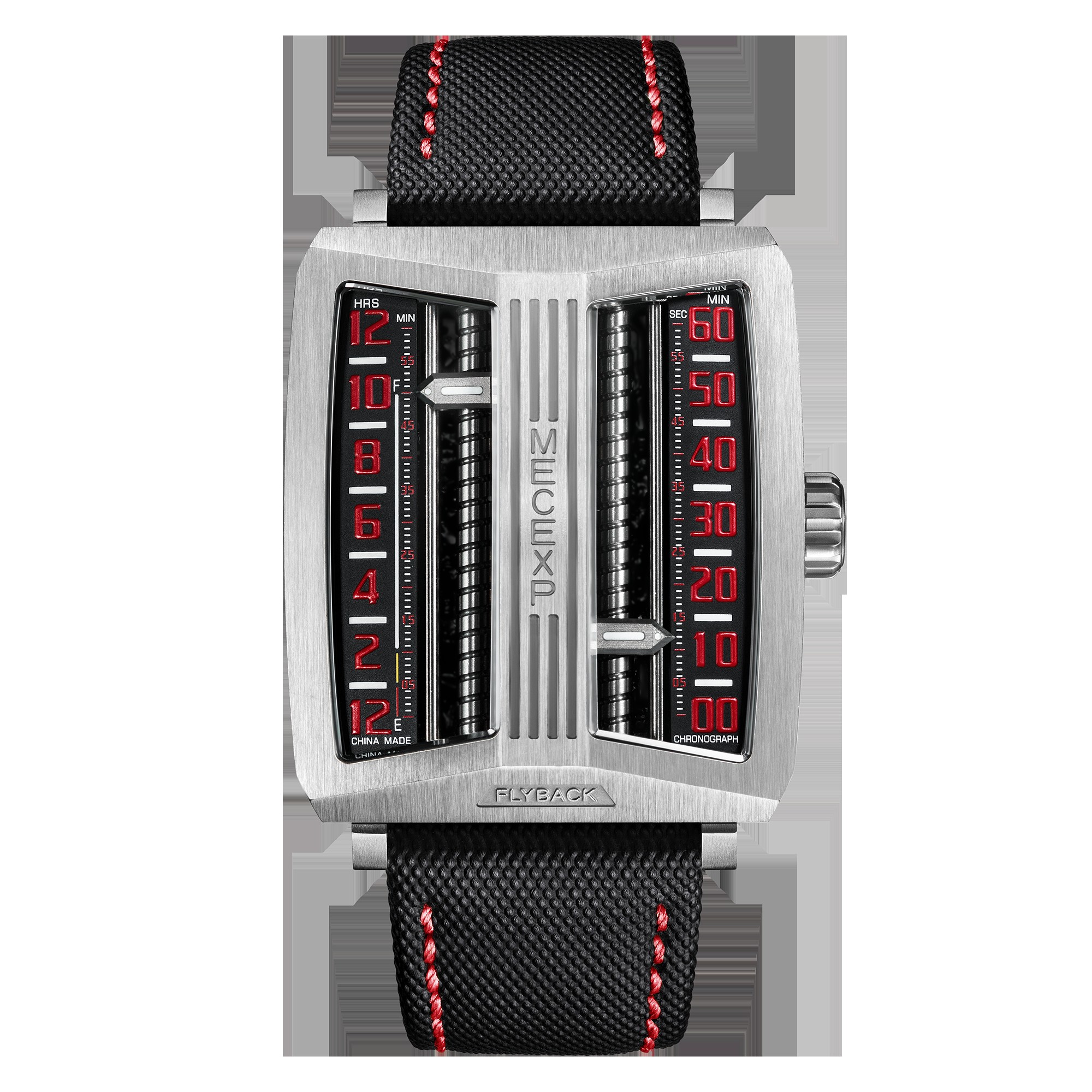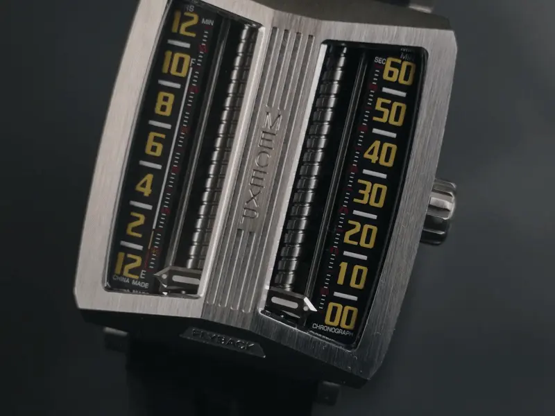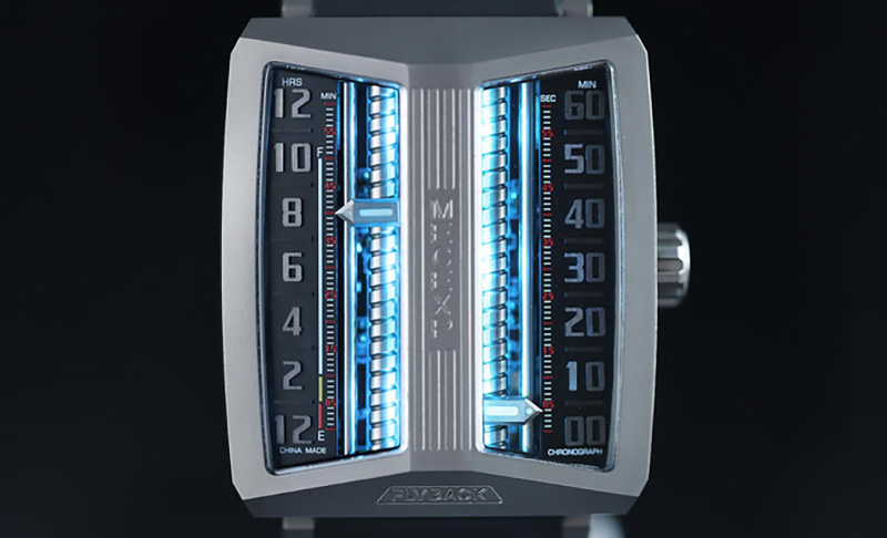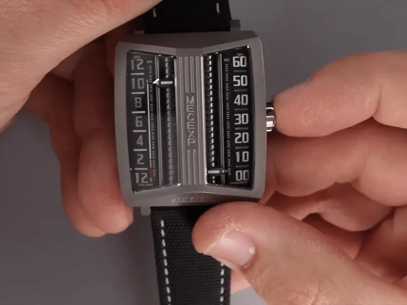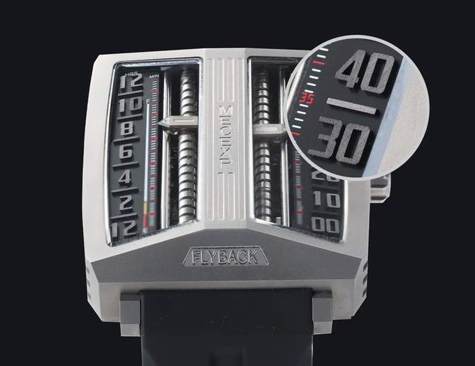 The dial of the MS1001, which fully reflects the designer's originality, breaks away from traditional design. On the left, hours and minutes (timekeeping mode) are displayed, while on the right, minutes and seconds (timekeeping mode) are shown.