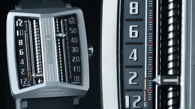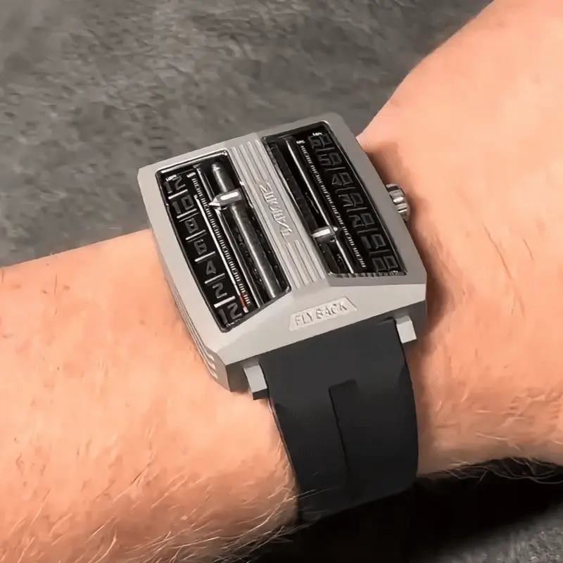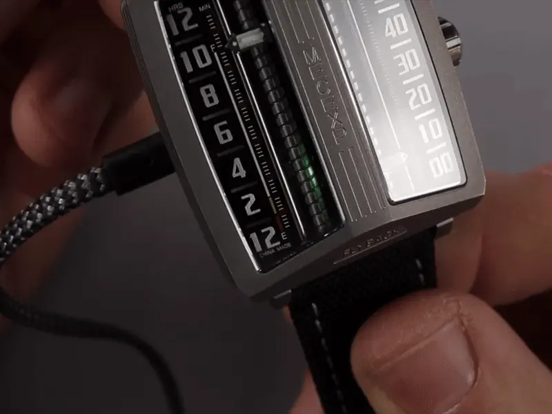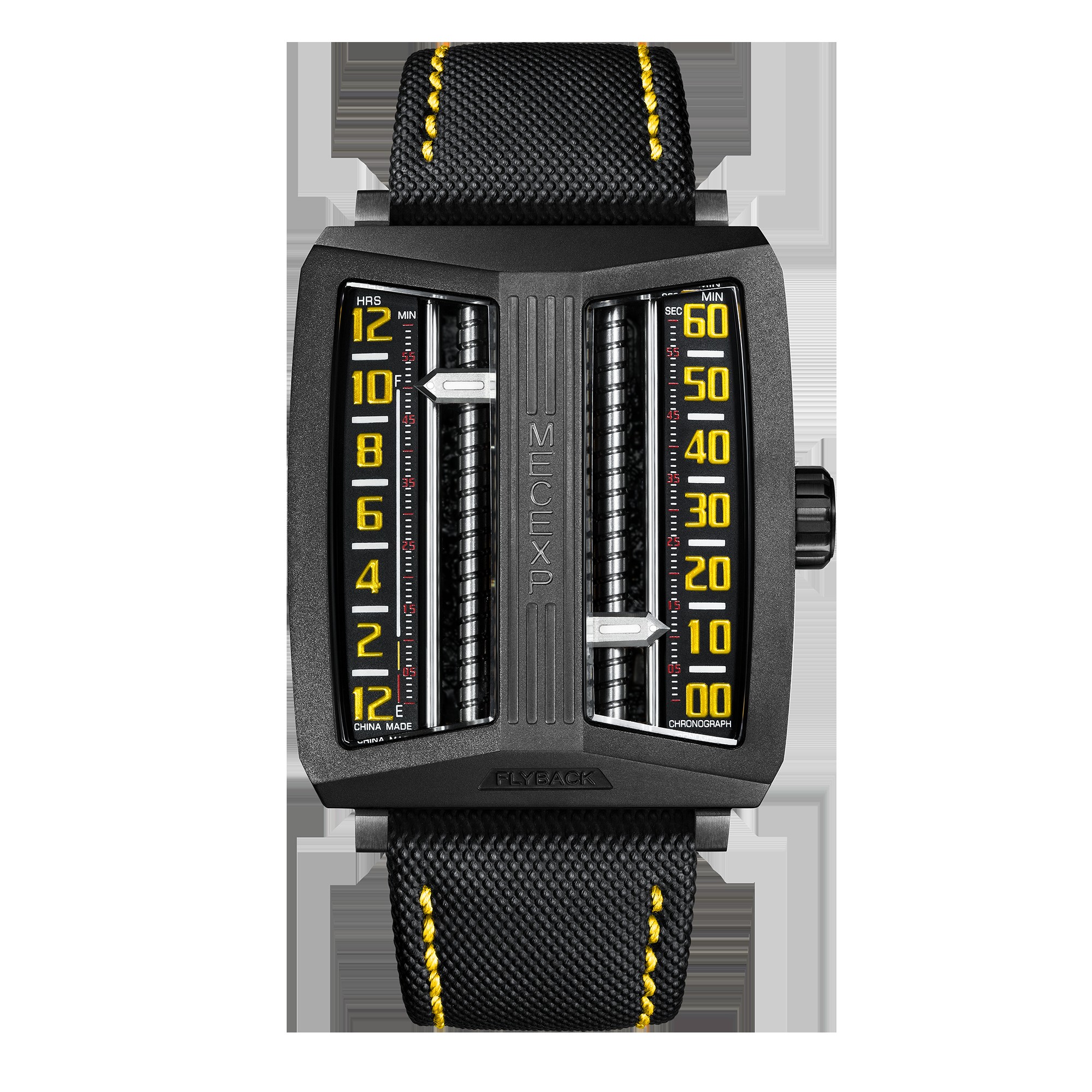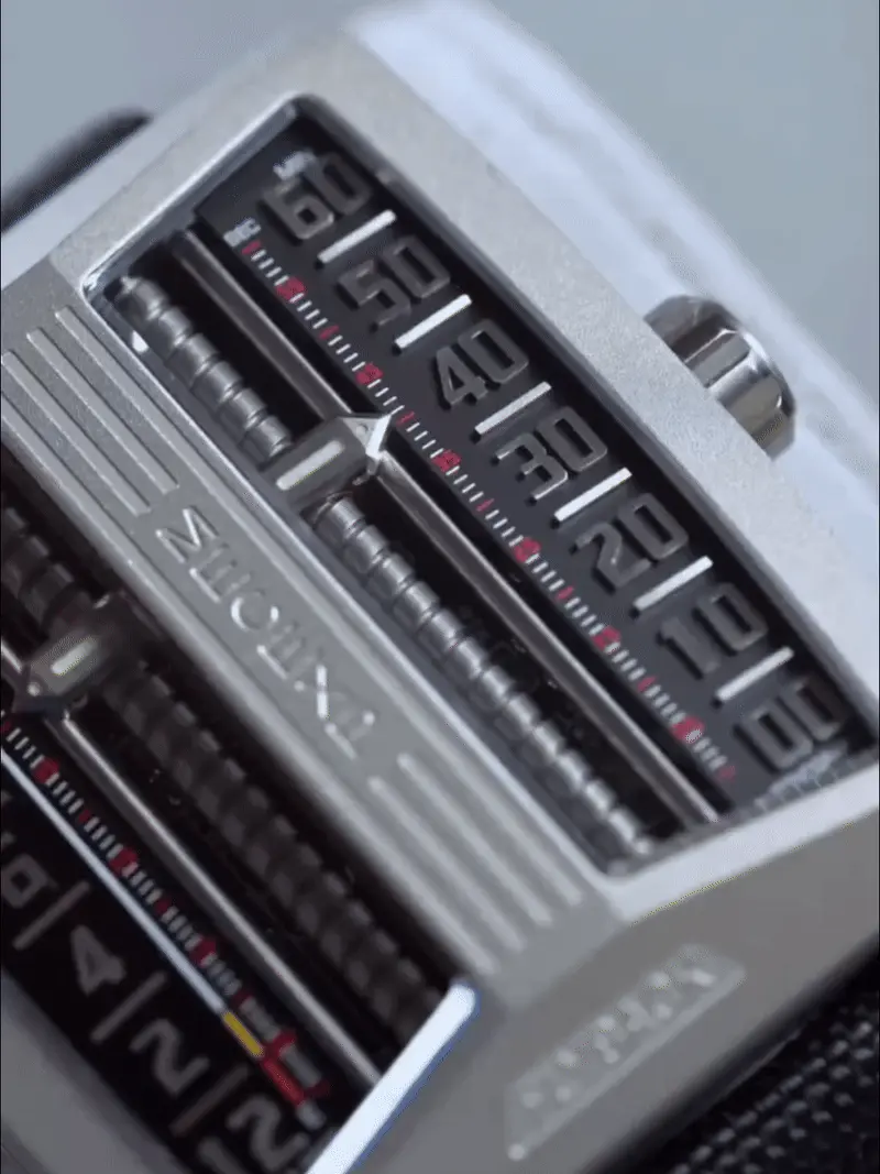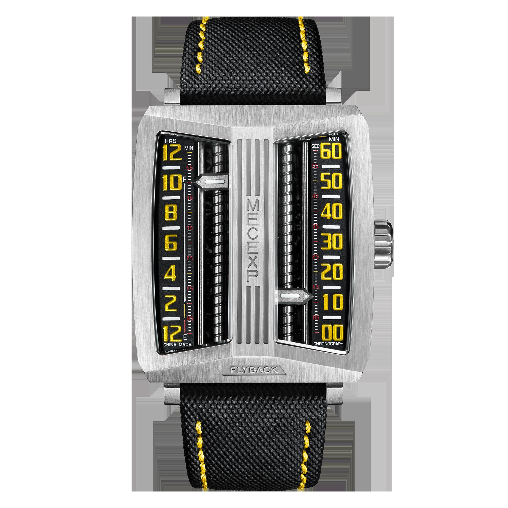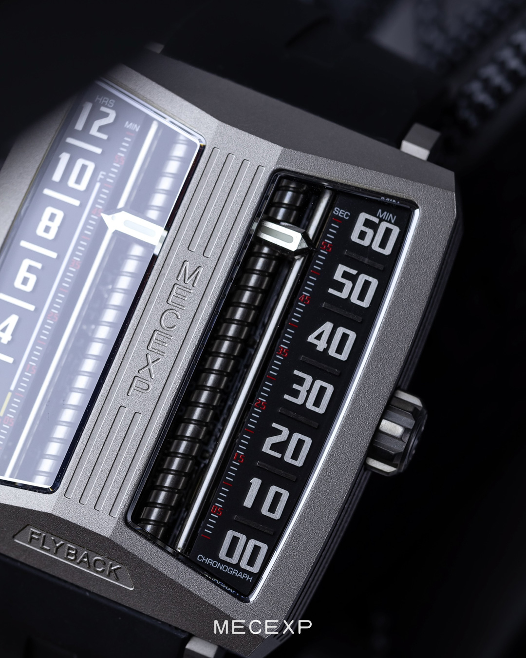 The dial of the MS1001, which fully reflects the designer's originality, breaks away from traditional design. On the left, hours and minutes (timekeeping mode) are displayed, while on the right, minutes and seconds (timekeeping mode) are shown.