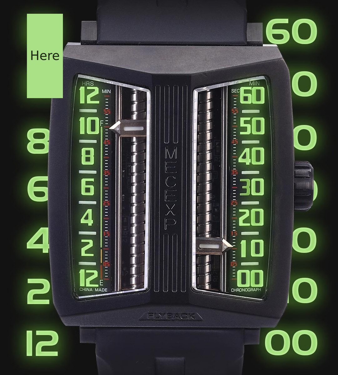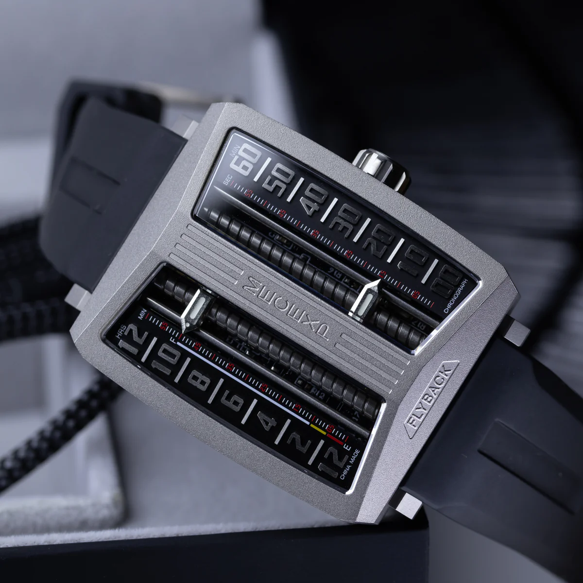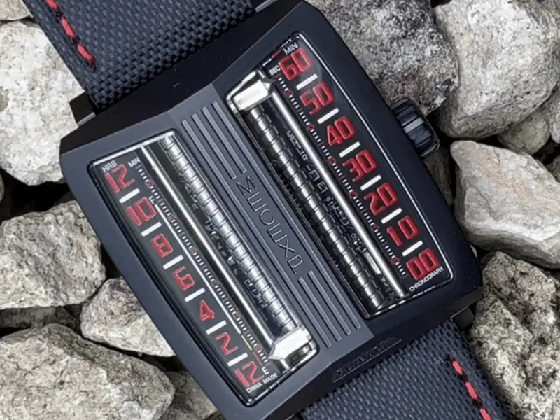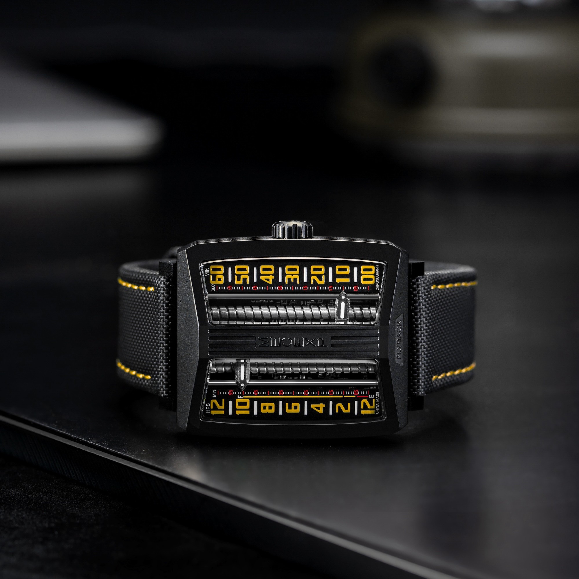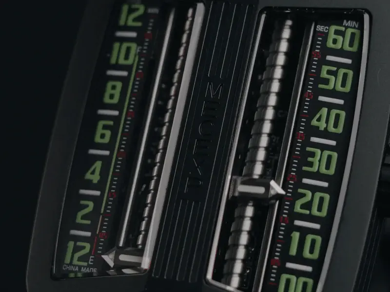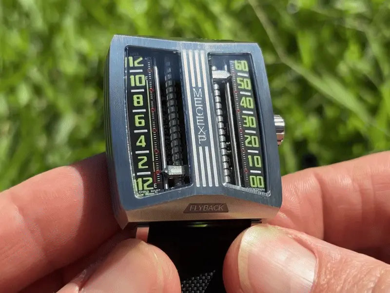 The dial of the MS1001, which fully reflects the designer's originality, breaks away from traditional design. On the left, hours and minutes (timekeeping mode) are displayed, while on the right, minutes and seconds (timekeeping mode) are shown.