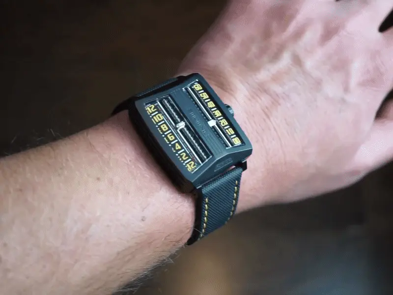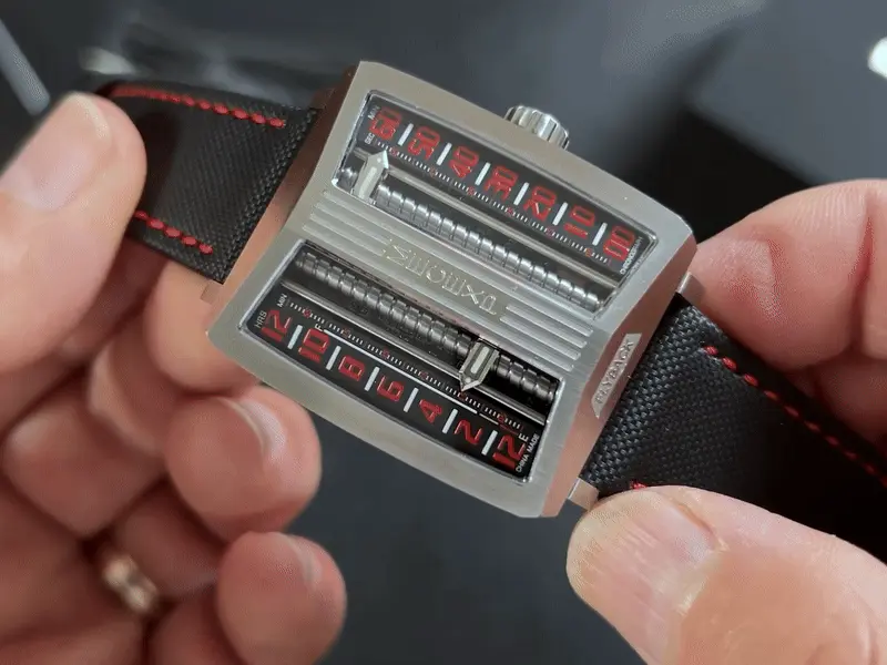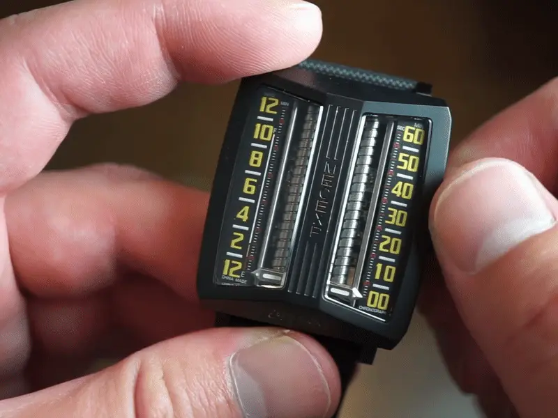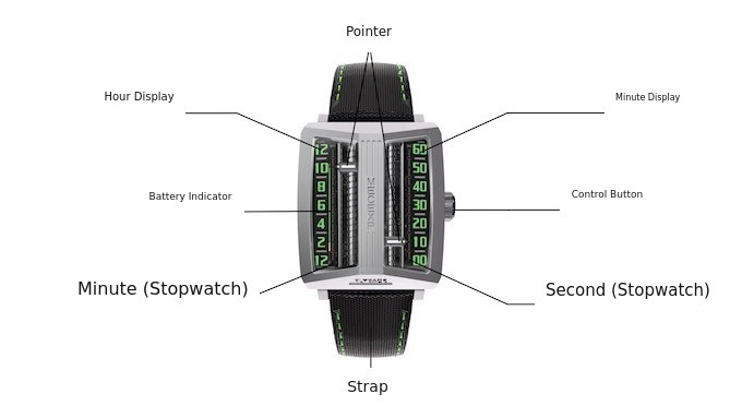 The time display moves in an analog manner, but the various hidden features inside this watch add to its surprise.Time is set in a way similar to digital watches, but displayed in analog form.