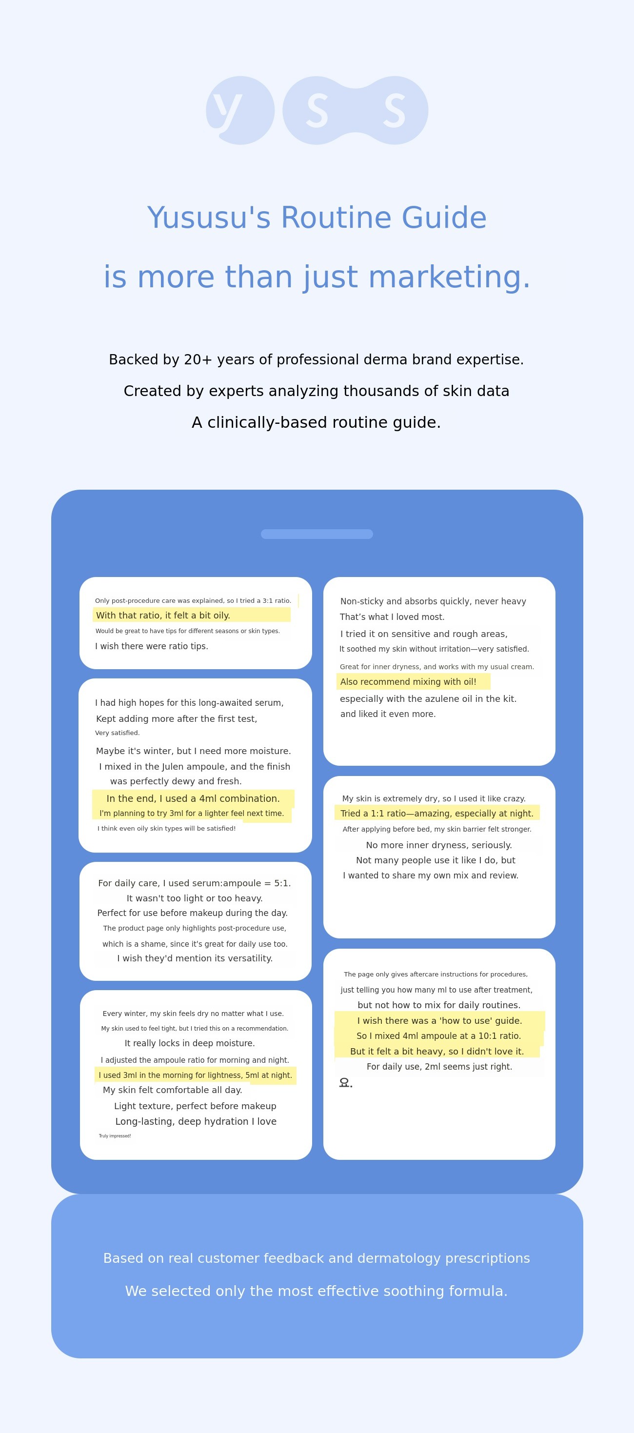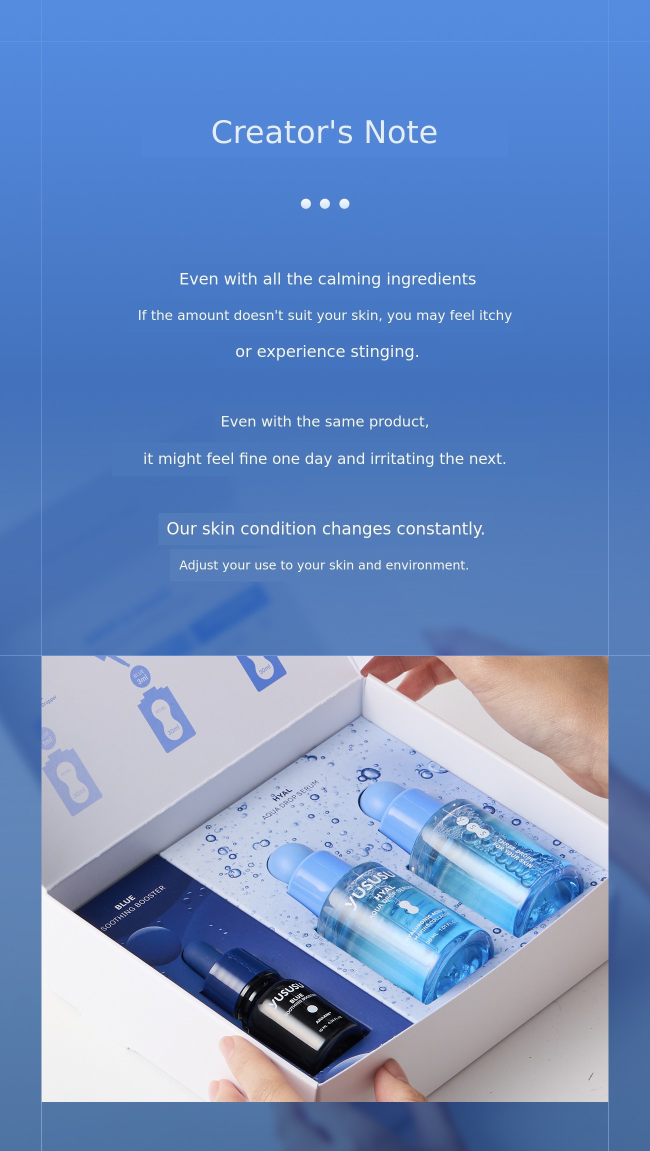 A. Of course! However, Yususu serum step ‘alone even with just soothing + Moisturizing Routine Completed’Because of its structure , you do not need to layer too many products. Also the remaining Blue Soothing Booster The cream you are using, mask or pad can be mixed and used. (It can enhance the calming effect for troubled skin.)