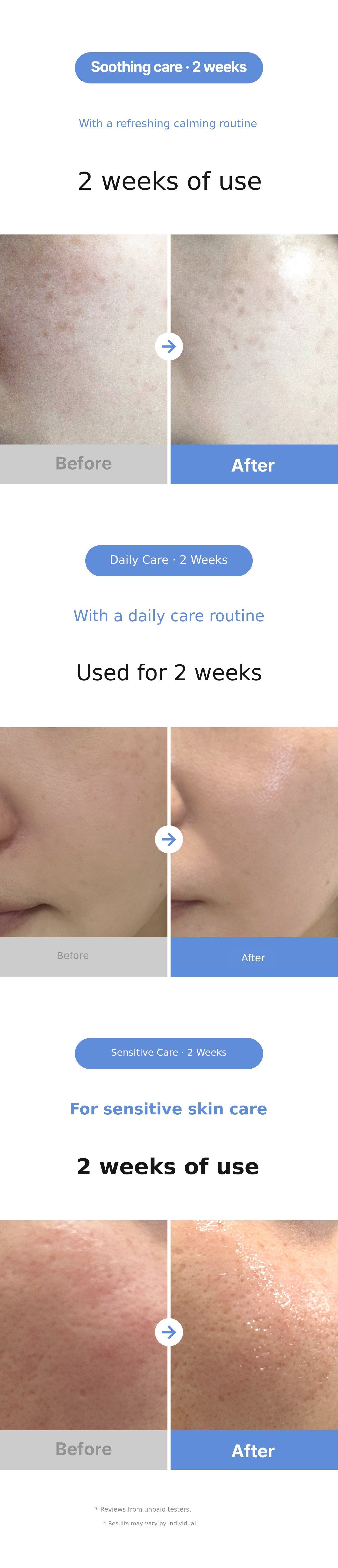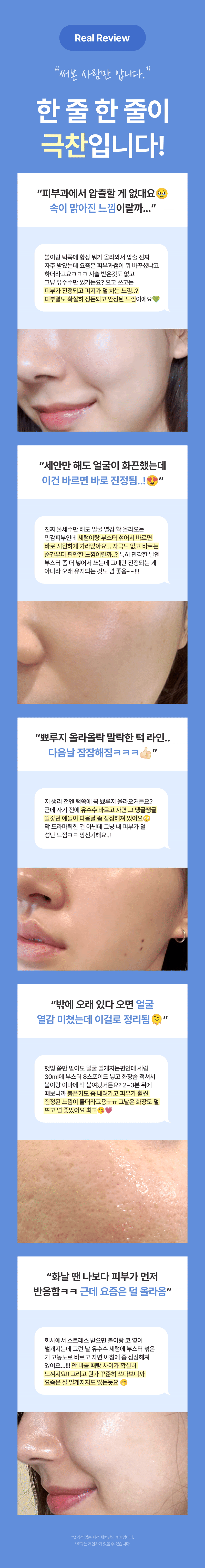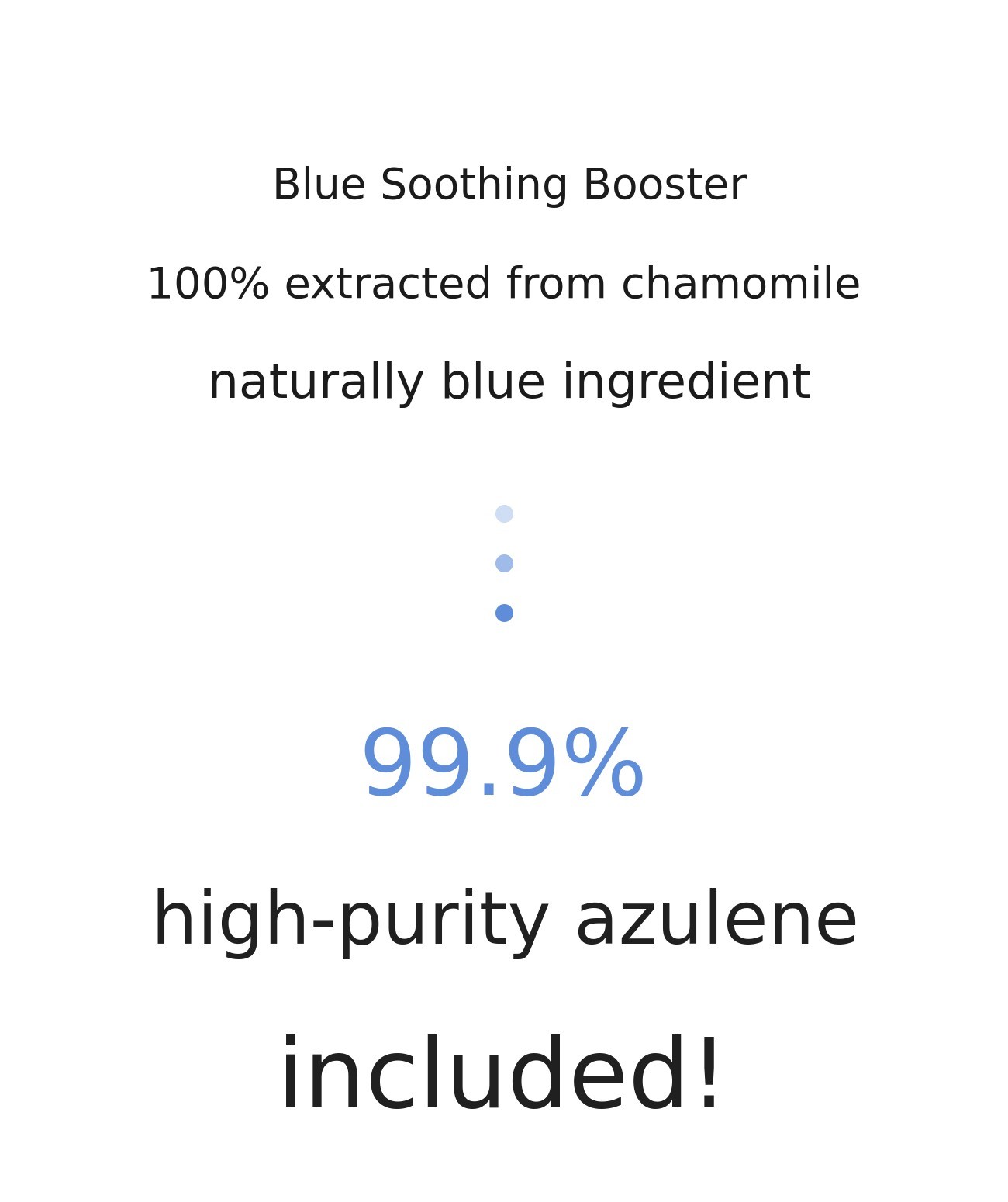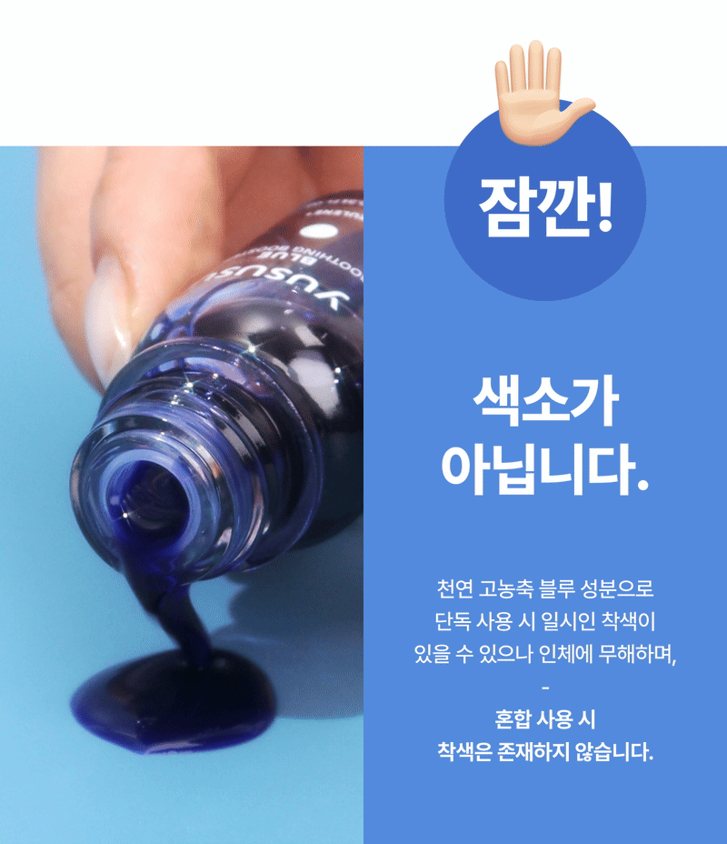 - 'Blue Soothing Booster' contains a highly concentrated blue azulene extracted from chamomile, which may cause temporary blue staining when used alone, but it will disappear over time after use. For intensive soothing, we recommend applying it alone at night.