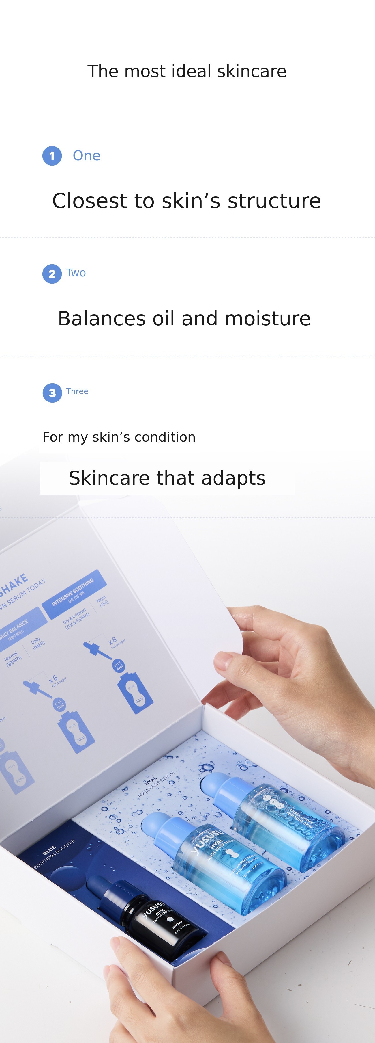 Yususu is a brand that contains one drop of oil, two drops of moisture, and three drops that most resemble my skin. It offers a precise balance of oil and moisture based on expert dermatological prescriptions, providing the perfect balance for your skin.