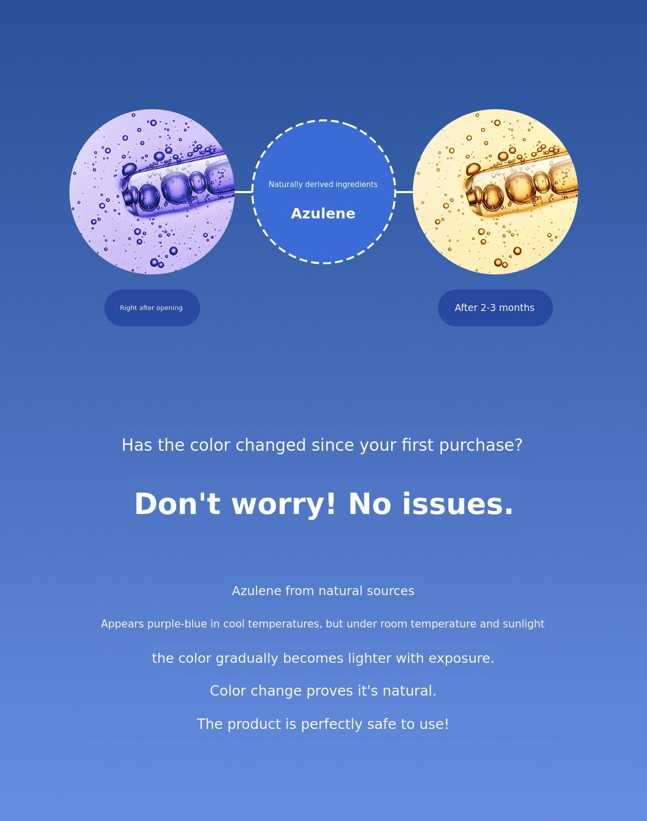 - Azulene, a naturally derived ingredient, has a beautiful blue color, but its color may gradually change when exposed to light and heat. This color change is a natural phenomenon of the ingredient and does not affect the product at all, so please use it with confidence. (To maintain the blue color of natural azulene for a longer time, store it in a low-temperature cosmetic refrigerator or cosmetic box, away from direct sunlight or heat.)