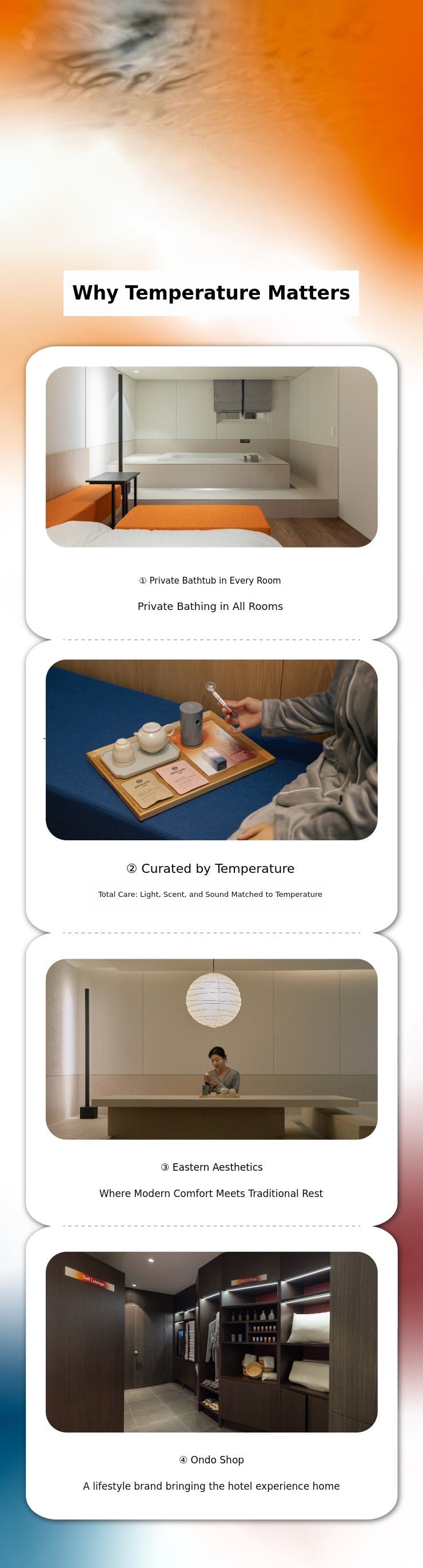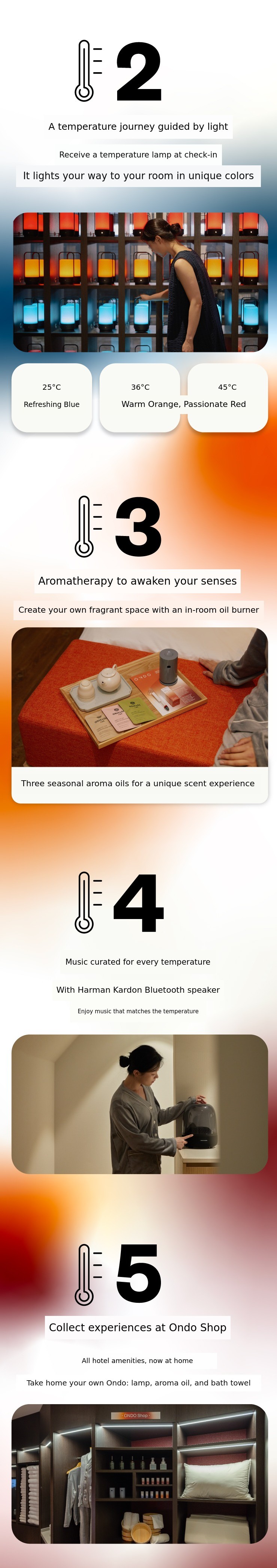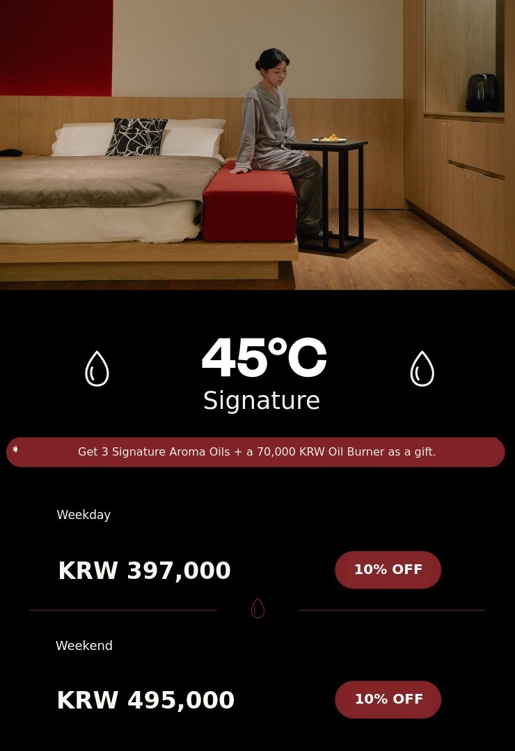 1. πŸ› Oriental Style Spa Hotel ONDO Jongno - Customized temperature-based private bath and rest 2. 🌿 Sensory Curation Service - Light, aroma, and music create unique temperature experience 3. 🎁 Exclusive Reward Gifts - Includes 3 aroma oils, loungewear, and oil burner