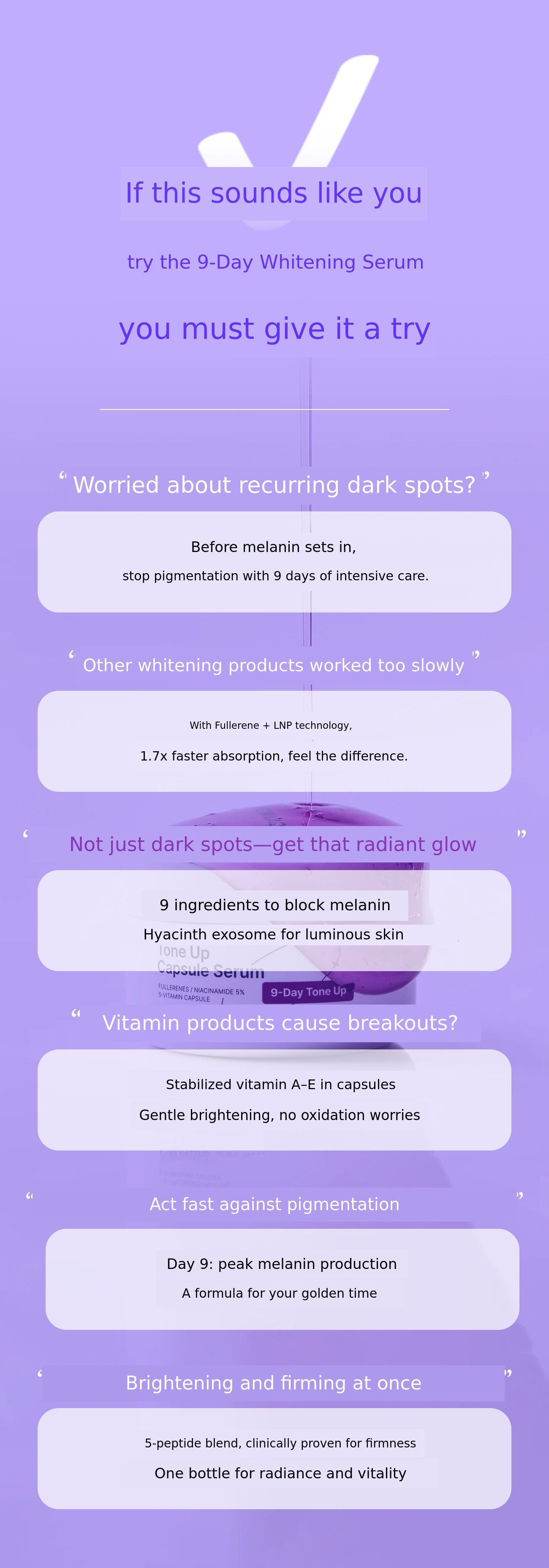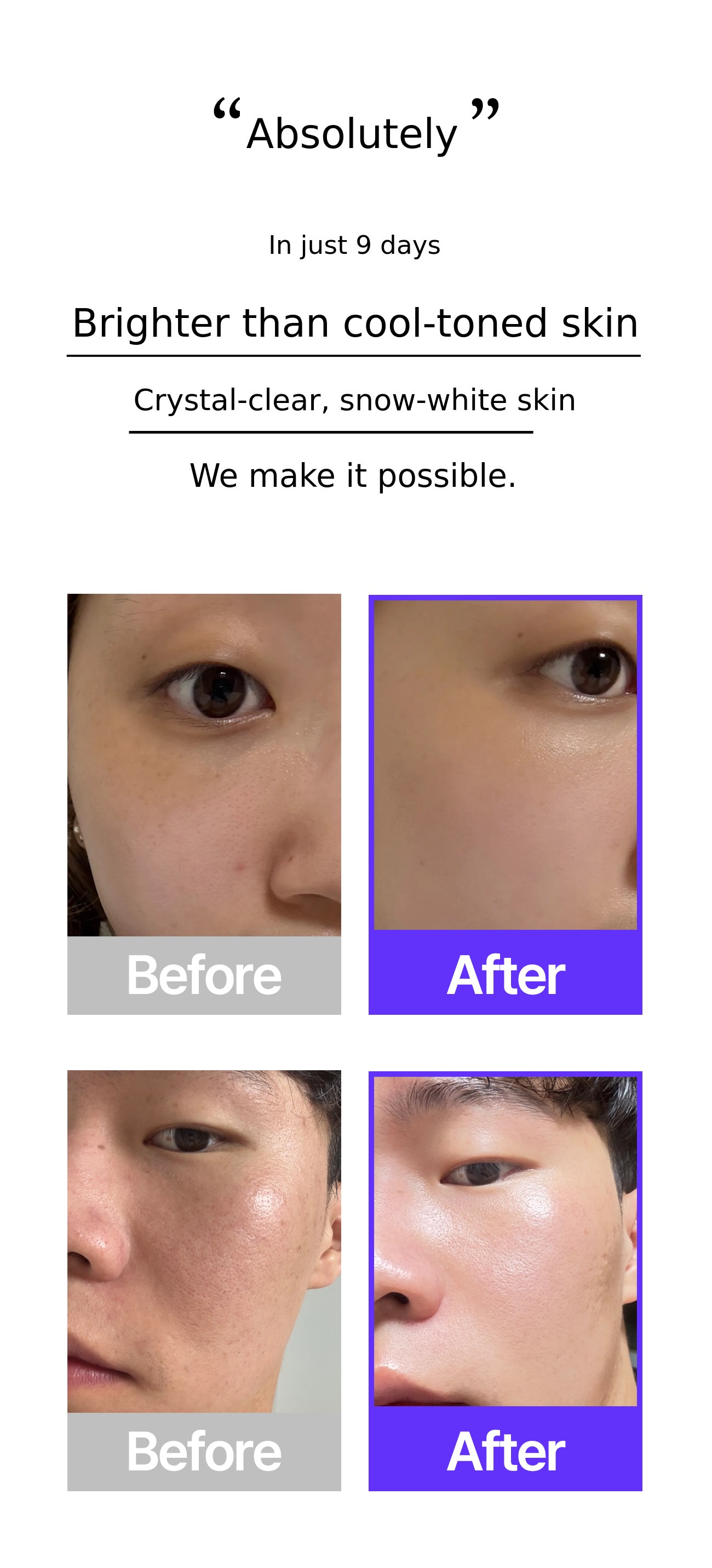 A. According to actual clinical trials and consumer tests,Changes in skin tone improvement and blemish reduction can be felt within 9 days. There were many users. Of course, results may vary depending on individual skin conditions, but this product is designed for fast results.