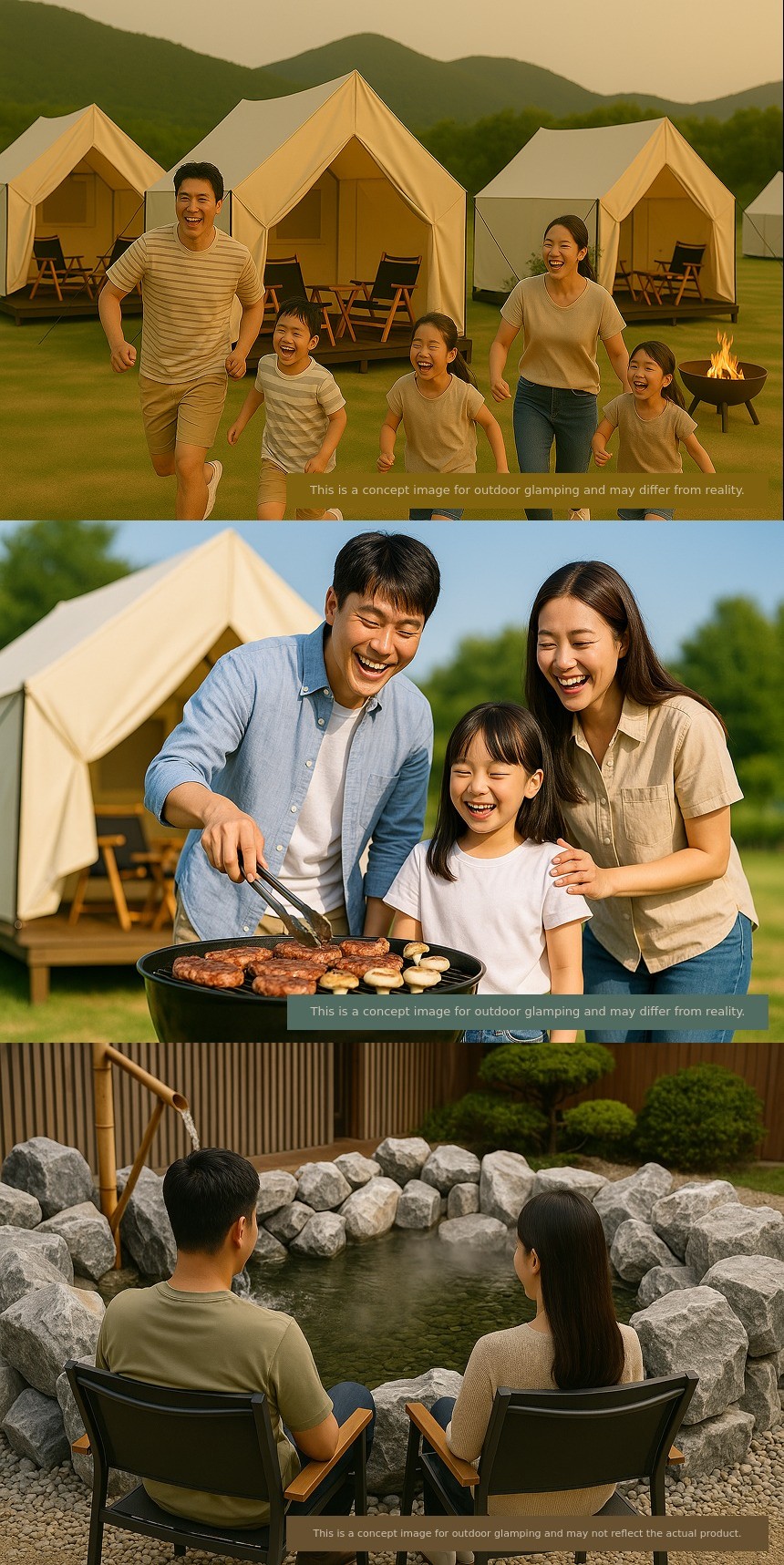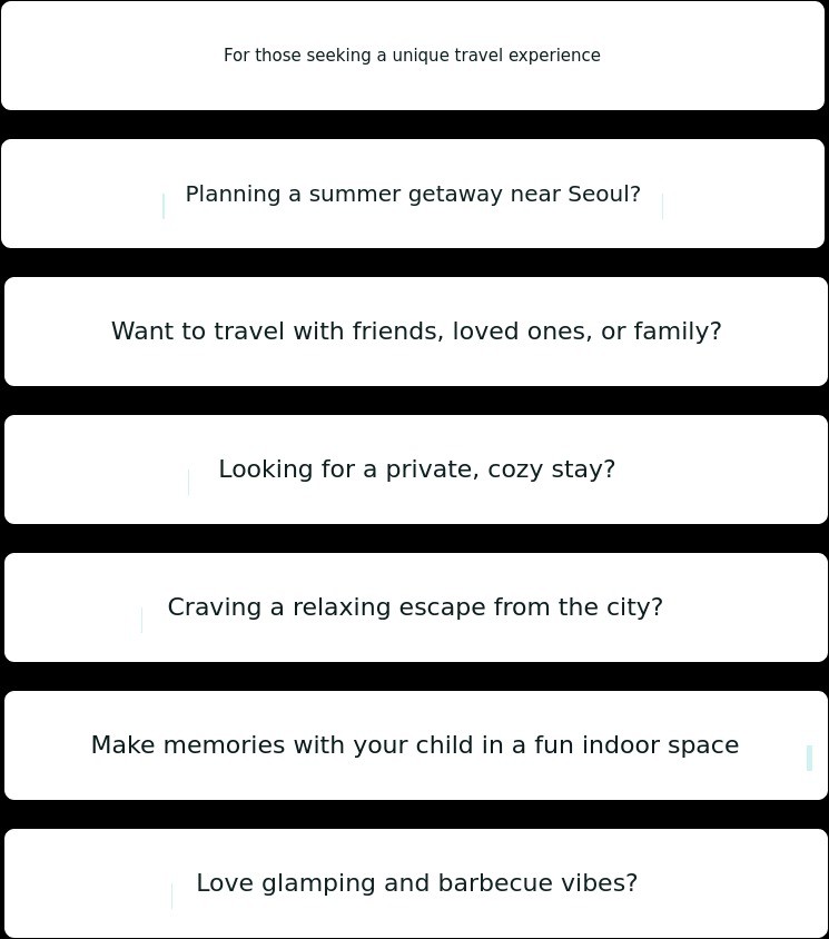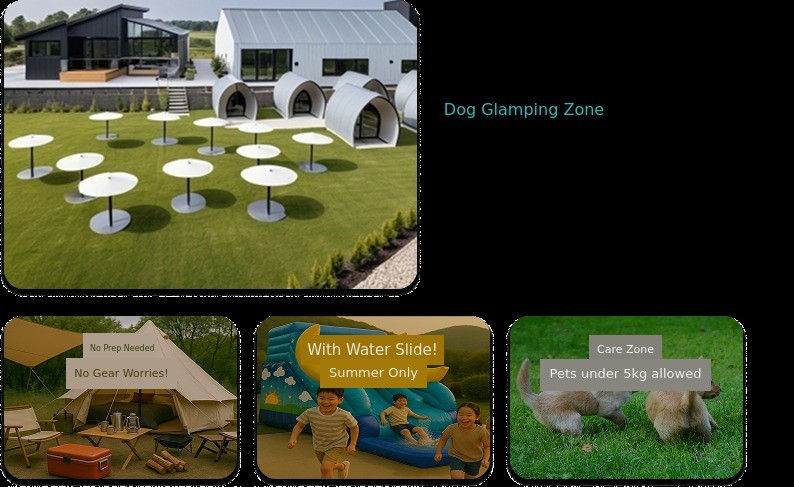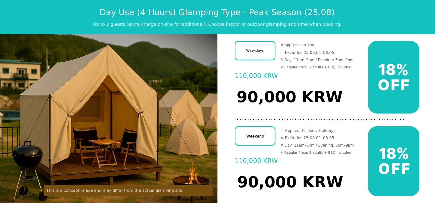 | Glamping zone Additional guests (Maximum 6 people) | 1 Adult 1 Child 1 Toddler 1 Infant | 55,000 KRW 35,000 KRW 15,000 KRW Free | - | Child (Ages 7β13) Toddler (Ages 7β36 months) Infant (Under 36 months) Barbecue included for additional guests |
