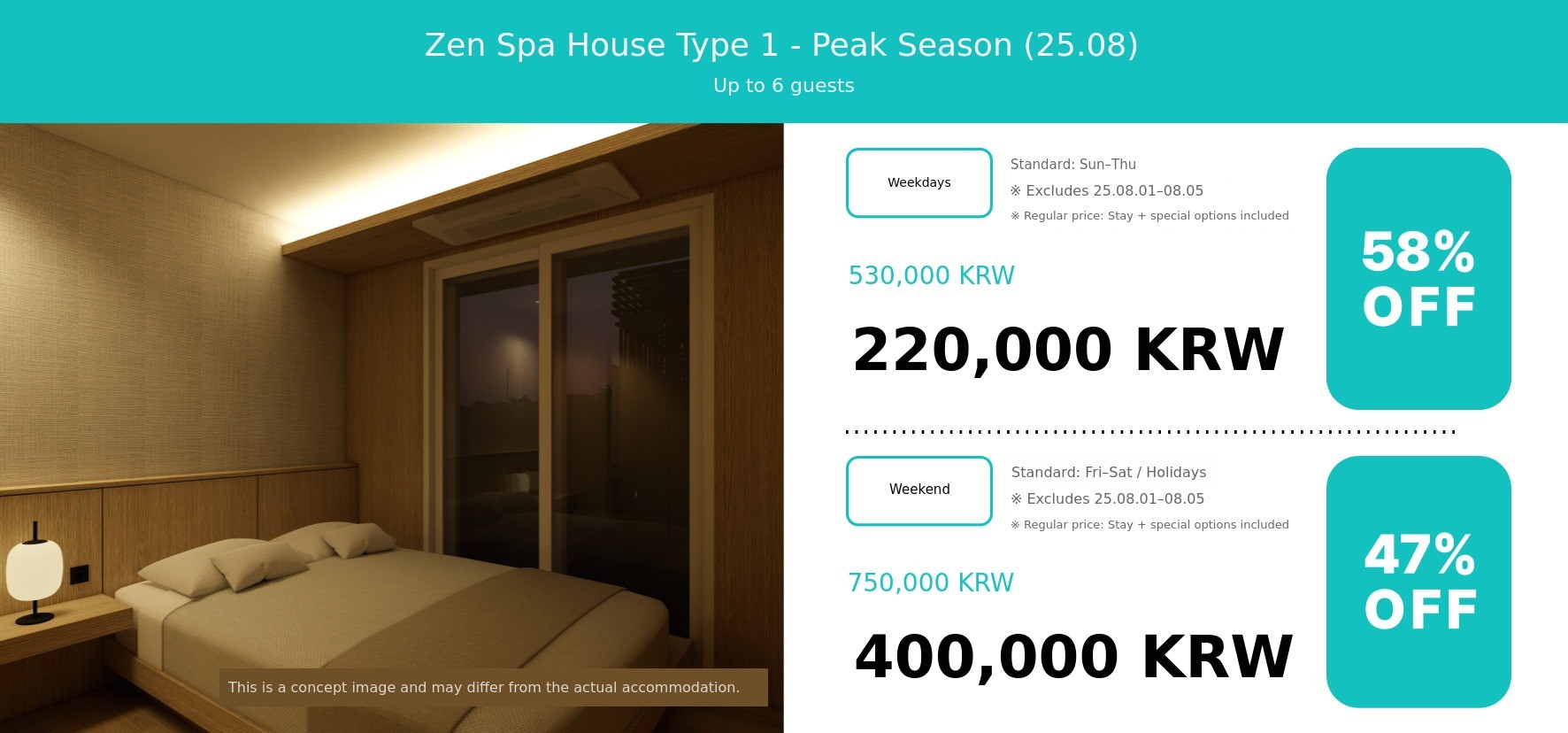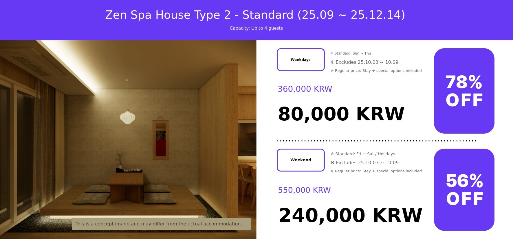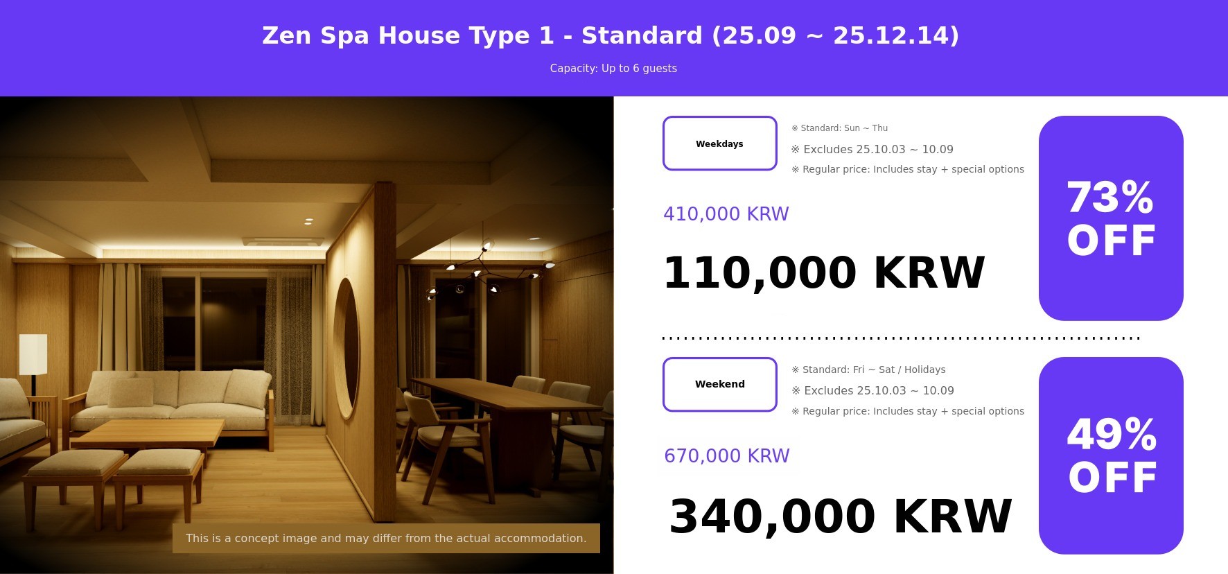 | Private Open-air spa | Once | 50,000 KRW | 25,000 KRW | Number of guests If you wish to proceed |