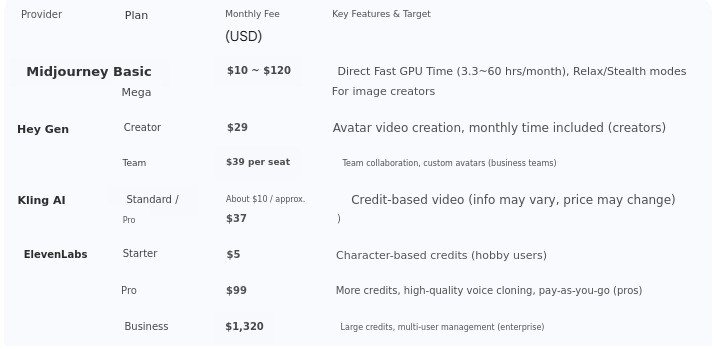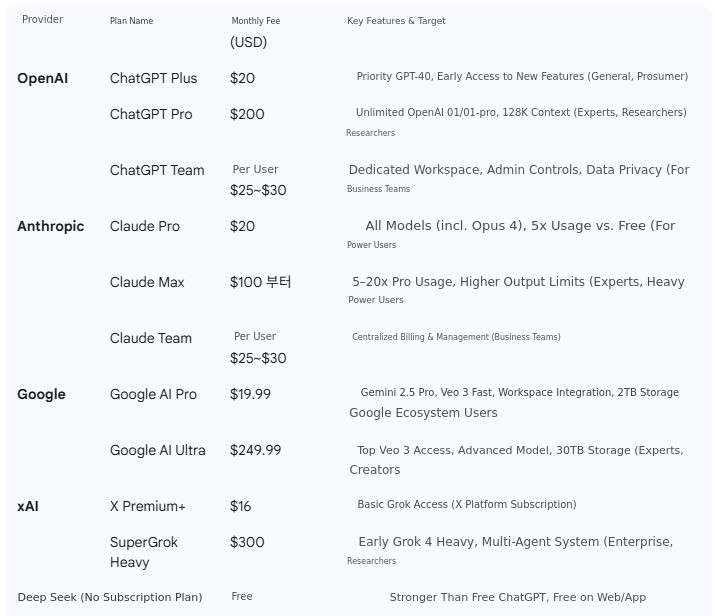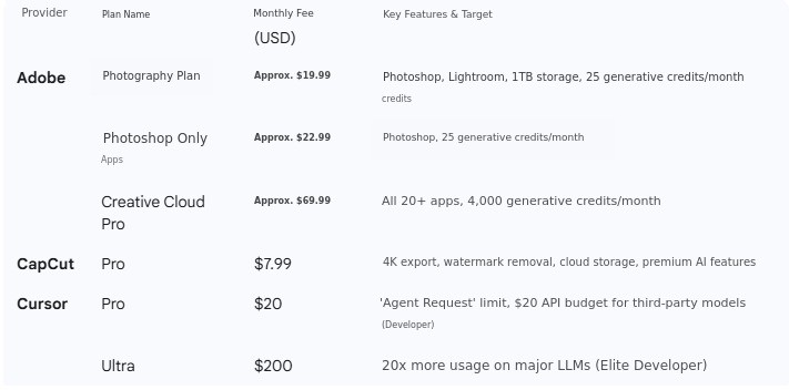 AI Tool Cost Summary Table (As of July)
