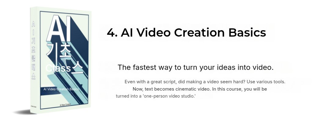 AI video production isstill a rapidly developing field, so now is the opportunity. If you understand the basic concepts and flow and gain experience before the technology fully matures, you can lead the upcoming era of even more powerful AI videos. Through this introductory course, you will reach the level of 'creating the necessary advertising videos yourself', and lay a solid foundation to advance into the limitless world of video content.
