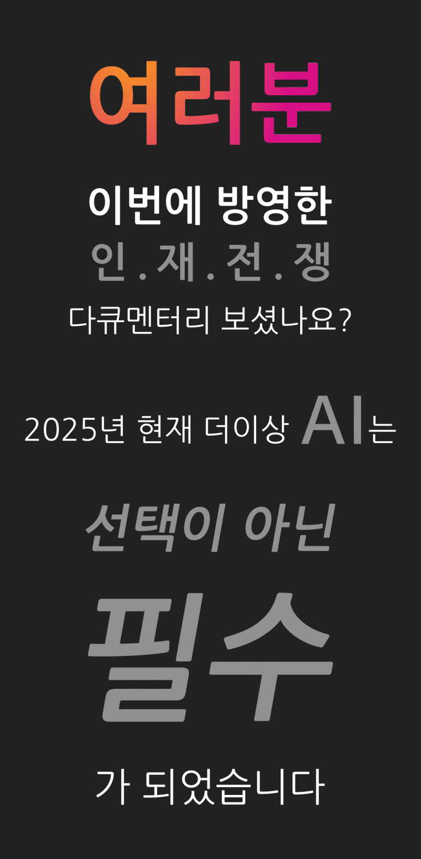 Competitors are already equipped with the powerful tool of AI and are running ahead. Do not postpone your infinite potential with the word 'later.' End your hesitation and take the first step toward your future. Go beyond repetitive tasks, create what no one has imagined, open new career paths, and prove your value.
