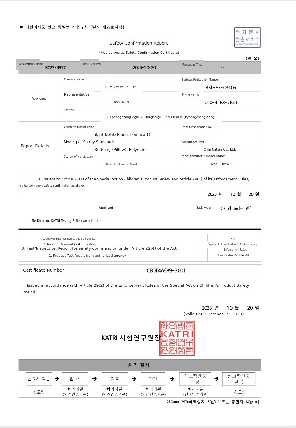 Modoo Pillow safety confirmation certification number: ะกะ014A689-3001