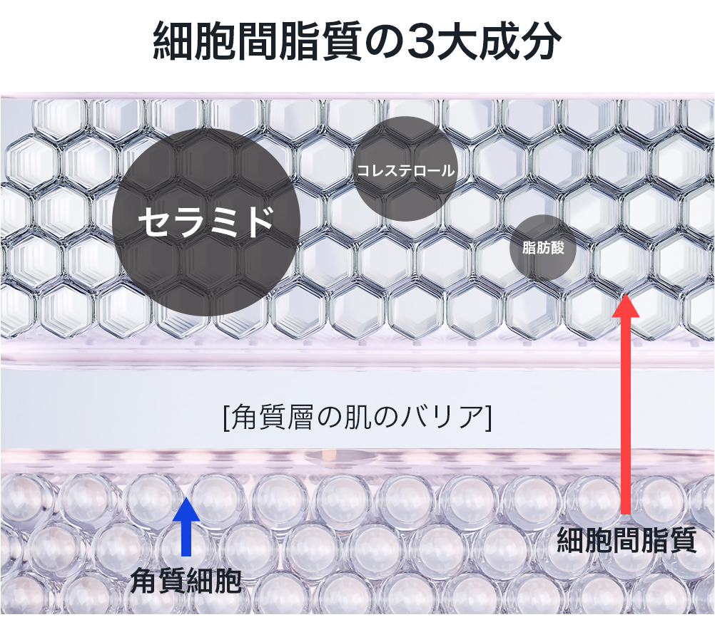 角質の間を埋めて肌のキメをなめらかにし、明るくて透明でつるつるな肌にするのがいいバリアの根幹である細胞間脂質です。肌が乾燥しないよう角質の間を埋めて水分の蒸発を防ぐ役割を持つのと同時に外部から肌を守ります!