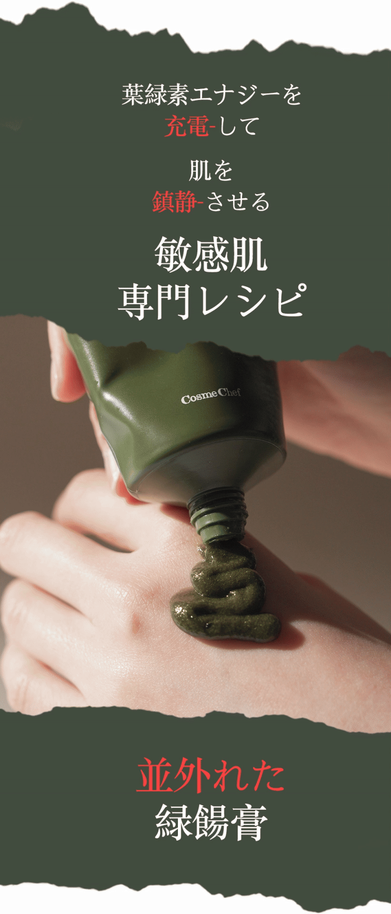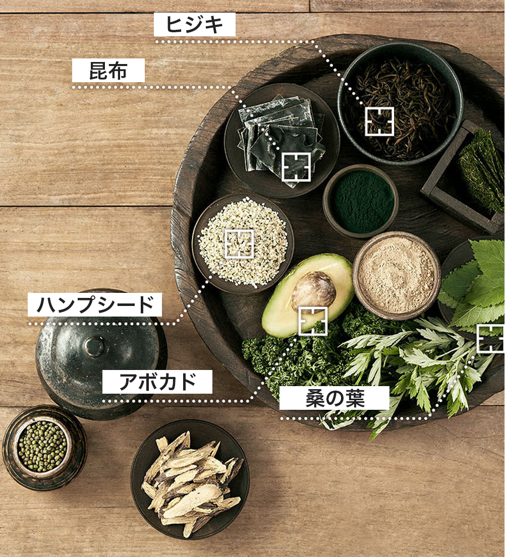 地球のみどりの葉緑素エナジーを最大限に抽出したシェフ特製の緑餳膏ソースと優れた洗浄力を持つ粘液質のオリーブオイル、そして肌鎮静とバリア強化に役立つ海藻類の緑色粘液質を組み合わせました