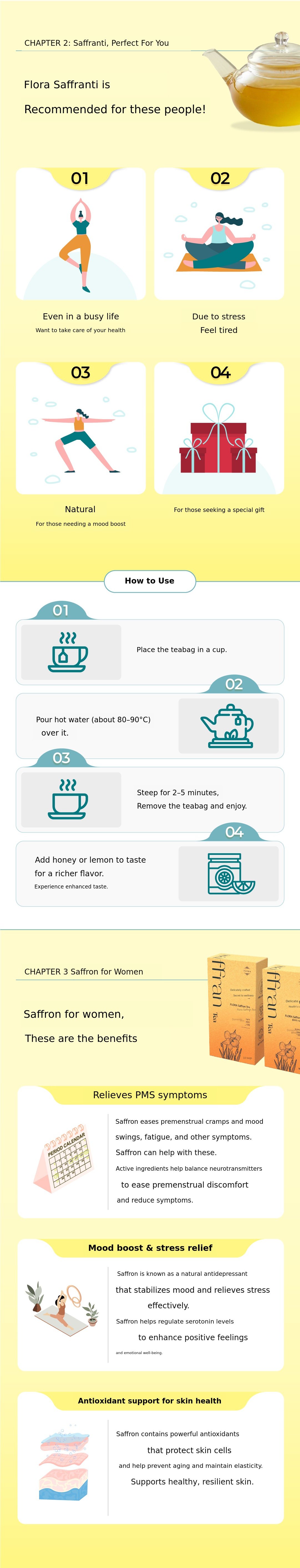 Enjoy the rich flavor of saffron easily with just one teabag, without any complicated preparation. As long as you have hot water, you can enjoy golden saffron tea anytime, anywhere.
