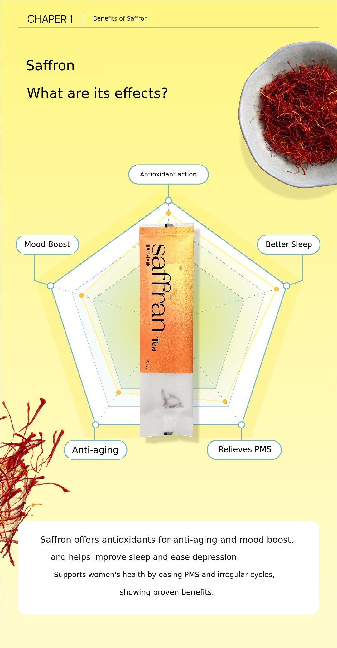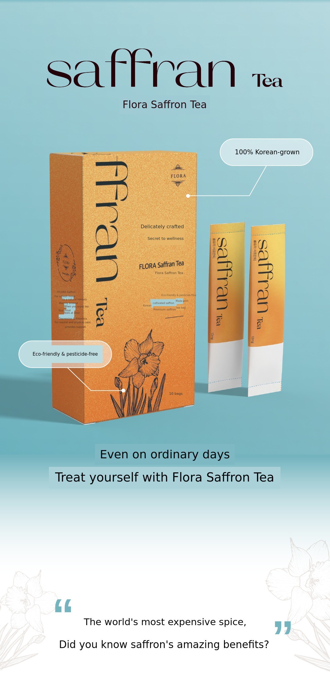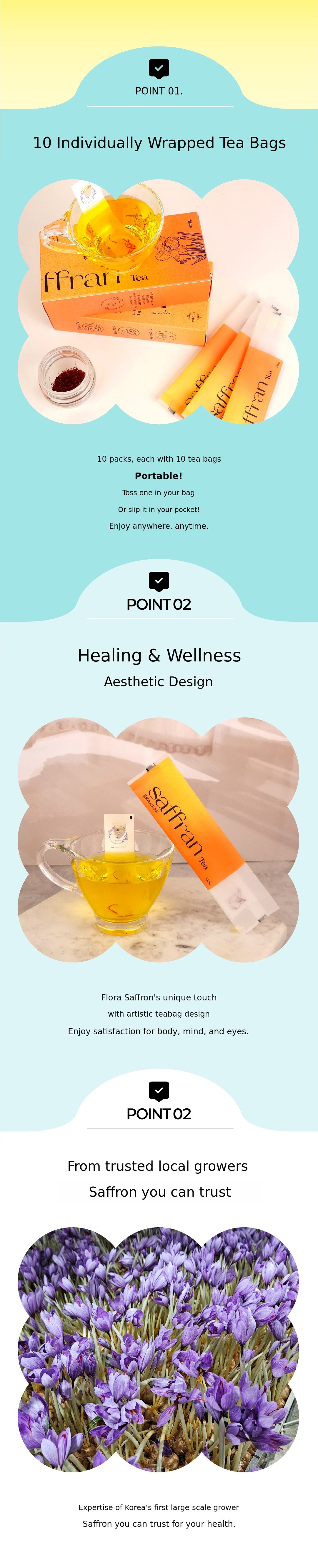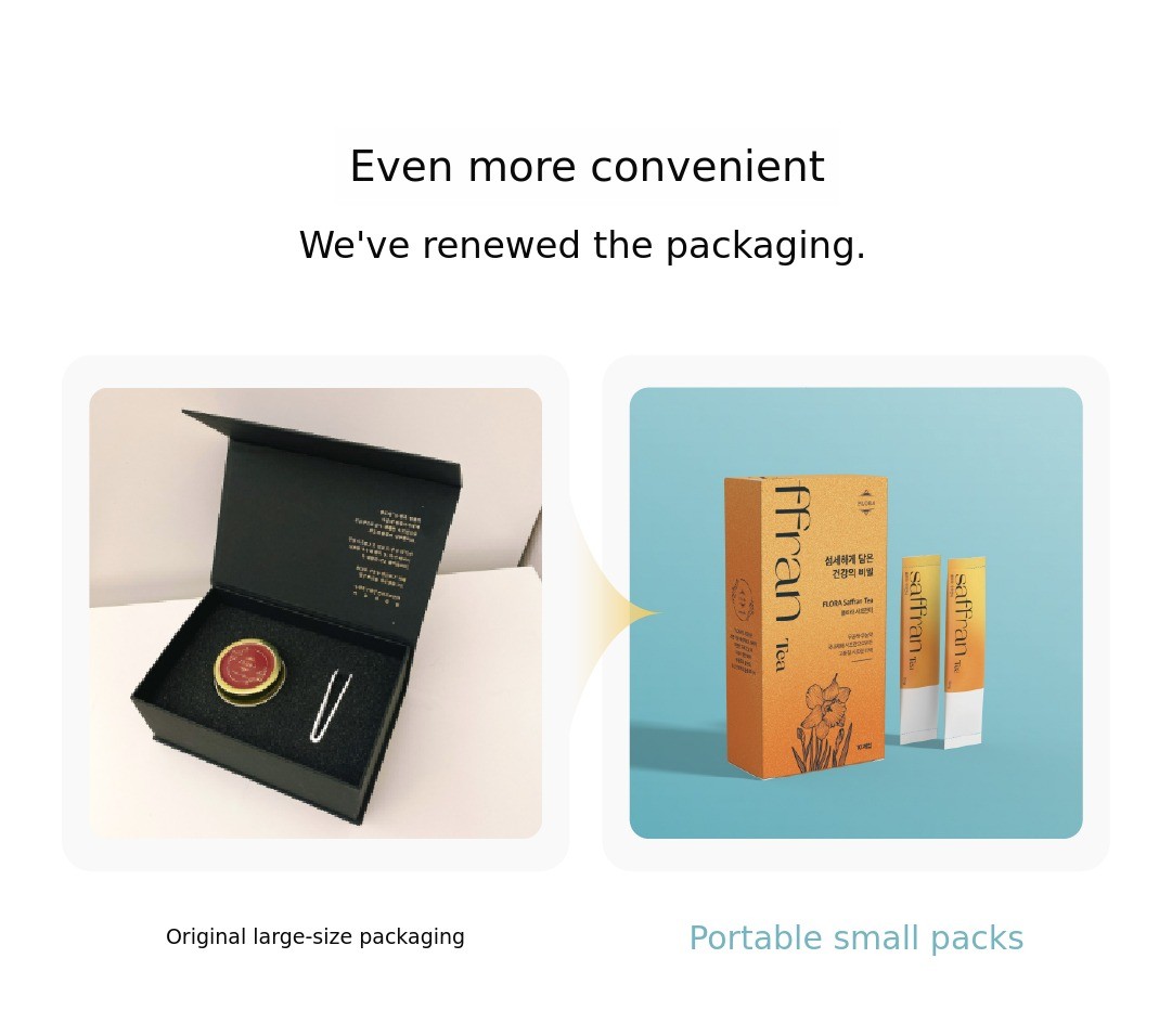 Some people may know it as a premium ingredient used in dishes like paella or pasta, but we have devised a way to easily consume this luxurious spice at home and created it in a tea bag form. After five years of extensive research, we now cultivate saffron directly in Korea, produce the tea ourselves, and sell it. Recently, we have renewed the packaging to make it even more convenient, so more people can easily enjoy it.