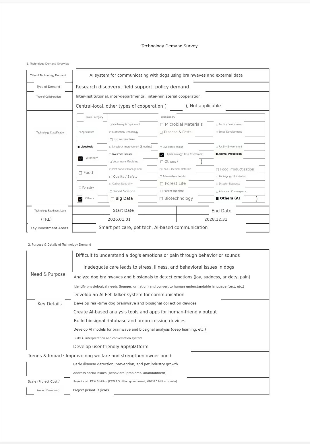 Core technology definition and data collection environment setup: Detailed definition of 10 behavioral/physiological indicators by condition. Selection and acquisition of EEG and biosignal sensors suitable for pets. Design of data collection protocols and initial AI model architecture research.