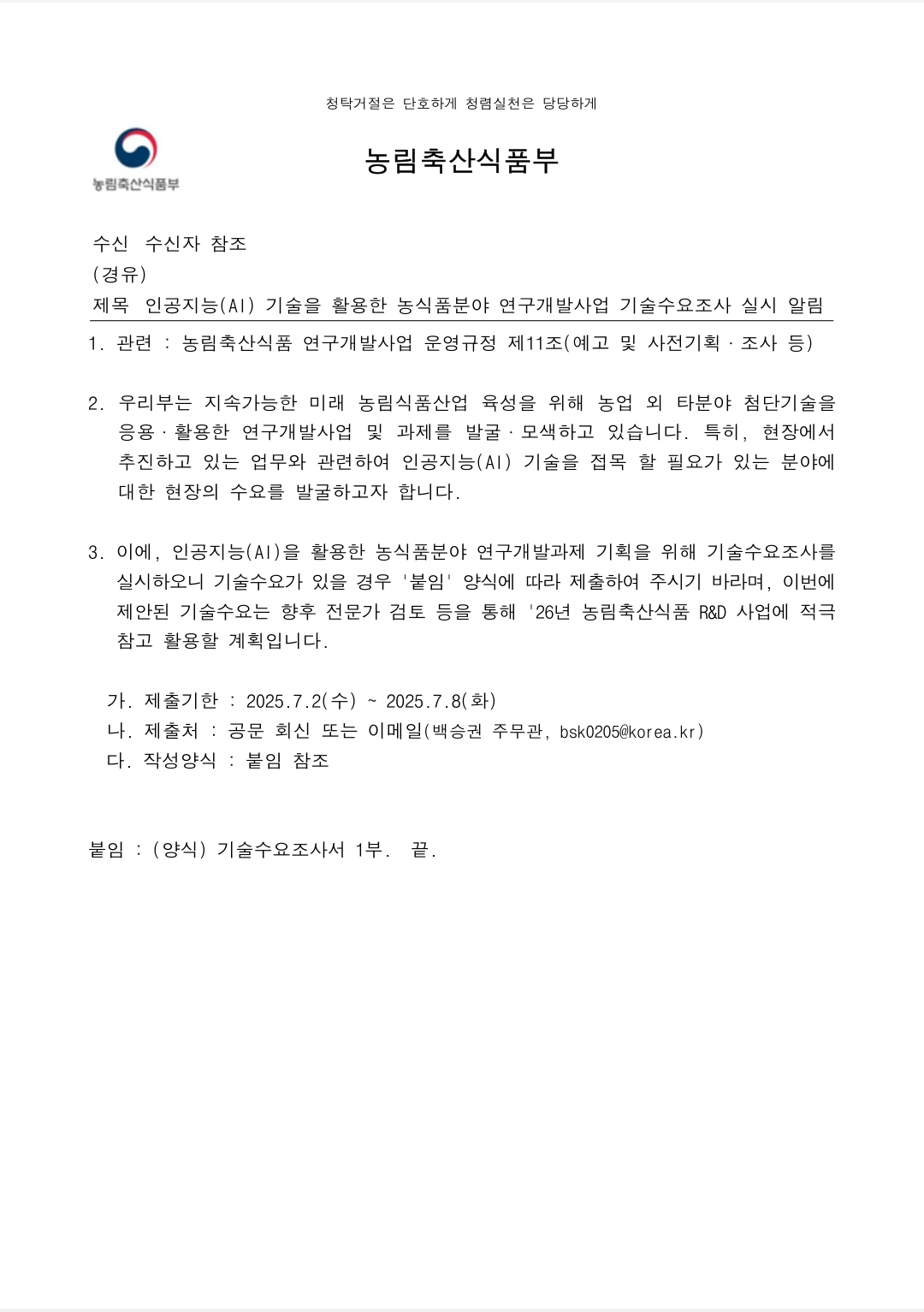 We participated in the Ministry of Agriculture, Food and Rural Affairs' 2026 AI Technology Demand Survey in July 2025.