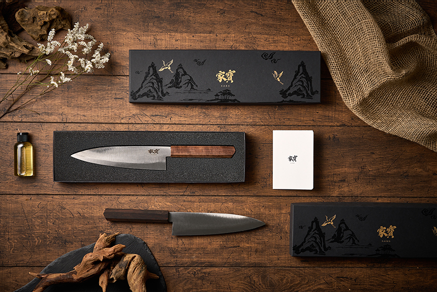 Gift wrapping, the creator's letter, a guarantee card with precautions, and camellia oil for knife maintenance are included.