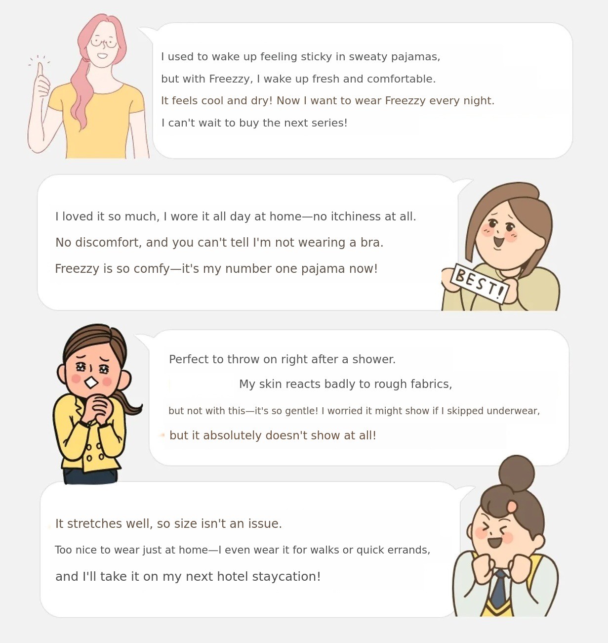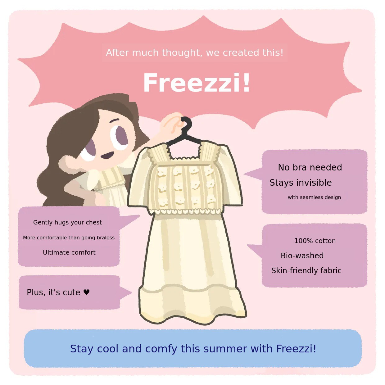 Because it touches your skin directly for a long time, Freezzi insists onnatural fabric, 'pure cotton'. Although it is more expensive and the production process is more complicated,100% cotton is what we continue to insist on.
